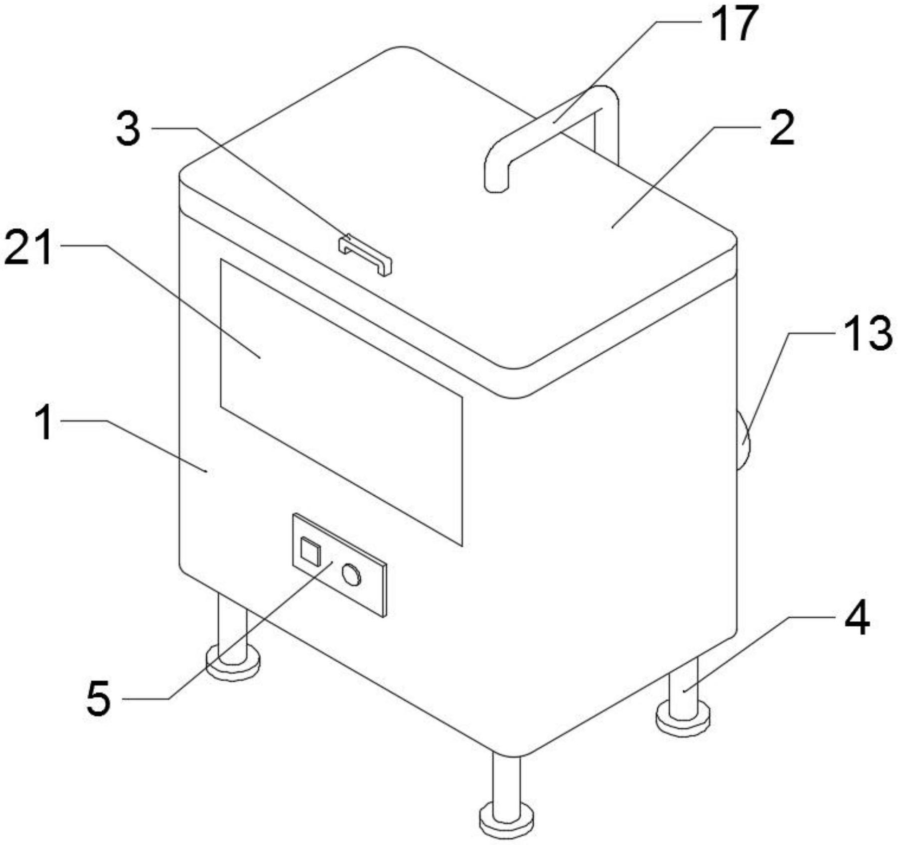 本实用新型公开了一种土豆清洗设备,包括:清洗箱、清洗机构和喷淋机构,所述清洗箱顶侧通过铰链铰接有箱盖,所述箱盖上安装有第一提手,所述清洗箱底侧固定焊接有四个支撑腿,所述清洗箱前侧壁上安装有控制面板,所述清洗机构设置在清洗箱内腔中,所述喷淋机构设置在箱盖上。本实用新型通过水泵可将清洗箱内的水通过进水管和导水软管输送至喷淋头,经喷淋头喷洒对托盘上的土豆进行冲洗,冲洗的同时,低速电机通过转杆带动转柄转动,从而带动连接杆上下运动,再通过U型杆带动摆动架绕着转轴上下摆动,带动托盘上下摆动,使土豆在托盘上滚动,从而使得土豆表面的污泥等都能得到冲洗,大大提高了土豆的清洗效果。
