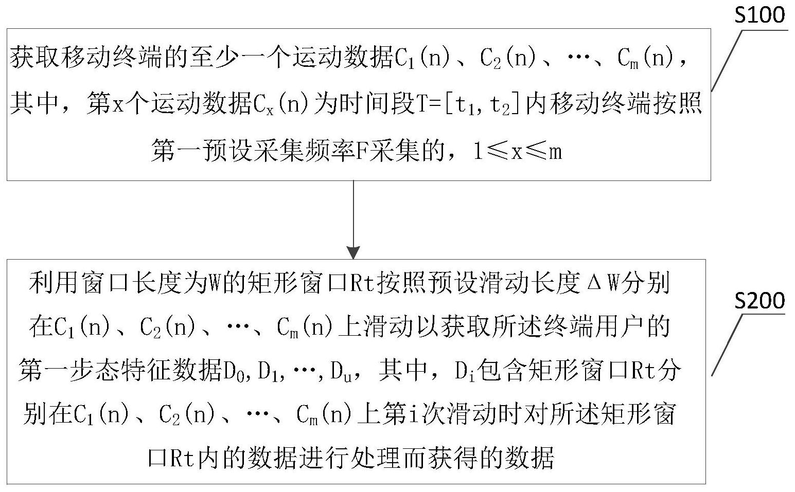 本发明涉及一种基于移动终端数据获取终端用户步态特征数据的方法,包括:步骤100,获取移动终端的至少一个运动数据C1(n)、C2(n)、…、Cm(n),其中,第x个运动数据Cx(n)为时间段T=[t1,t2]内移动终端按照第一预设采集频率F采集的,1≤x≤m;步骤200,利用窗口长度为W的矩形窗口Rt按照预设滑动长度ΔW分别在C1(n)、C2(n)、…、Cm(n)上滑动以获取所述终端用户的第一步态特征数据D0,D1,…,Du,其中,Di包含矩形窗口Rt分别在C1(n)、C2(n)、…、Cm(n)上第i次滑动时对所述矩形窗口Rt内的数据进行处理而获得的数据,0≤i≤u,ΔW即u为(T‑W)和ΔW的比值向下取整;进一步,W≥标准步态周期长度,所述标准步态周期长度为多个已知步态周期长度中的最大值。