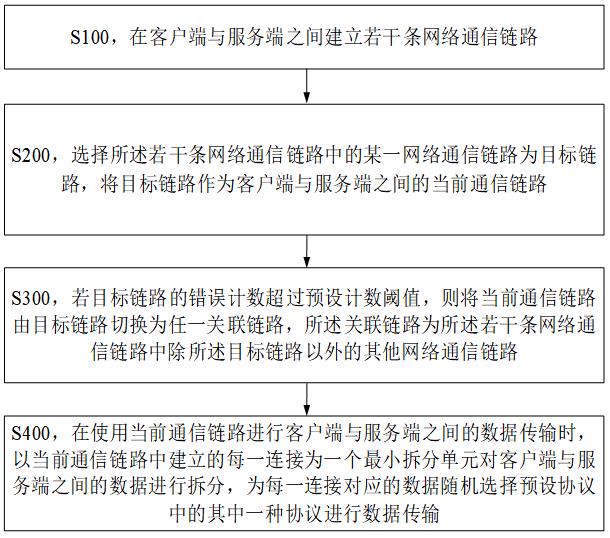 本申请涉及数字信息的传输领域,特别是涉及一种网络连接和传输的处理方法、装置、设备及介质。该方法包括:在客户端与服务端之间建立若干条网络通信链路;选择所述若干条网络通信链路中的某一网络通信链路为目标链路,将目标链路作为客户端与服务端之间的当前通信链路;若目标链路的错误计数超过预设计数阈值,则将当前通信链路由目标链路切换为任一关联链路;在使用当前通信链路进行客户端与服务端之间的数据传输时,以当前通信链路中建立的每一连接为一个最小拆分单元对客户端与服务端之间的数据进行拆分,为每一连接对应的数据随机选择预设协议中的其中一种协议进行数据传输。本发明能够提高客户端和服务端之间数据传输的稳定性及安全性。