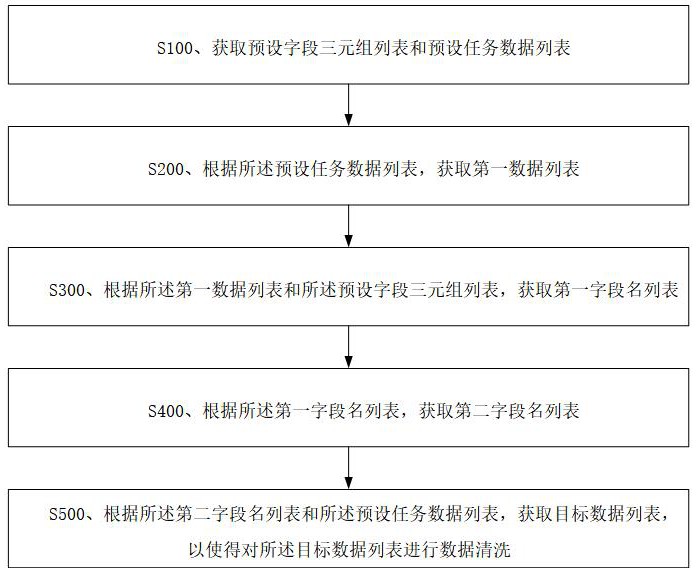 本发明涉及计算机技术领域,尤其是一种数据清洗方法、装置、设备及介质,其中,所述方法包括:获取预设字段三元组列表和预设任务数据列表;根据所述预设任务数据列表,获取第一数据列表;根据所述第一数据列表和所述预设字段三元组列表,获取第一字段名列表;根据所述第一字段名列表,获取第二字段名列表;根据所述第二字段名列表和所述预设任务数据列表,获取目标数据列表,以使得对所述目标数据列表进行数据清洗;可知,只使用一个通用性强的数据清洗判断条件对待处理数据进行数据清洗,存储量较小,不会造成资源浪费;对待处理数据按照多种方法进行处理,获取目标数据列表,减少了系统整体的数据处理量,有利于提高系统的运行效率。