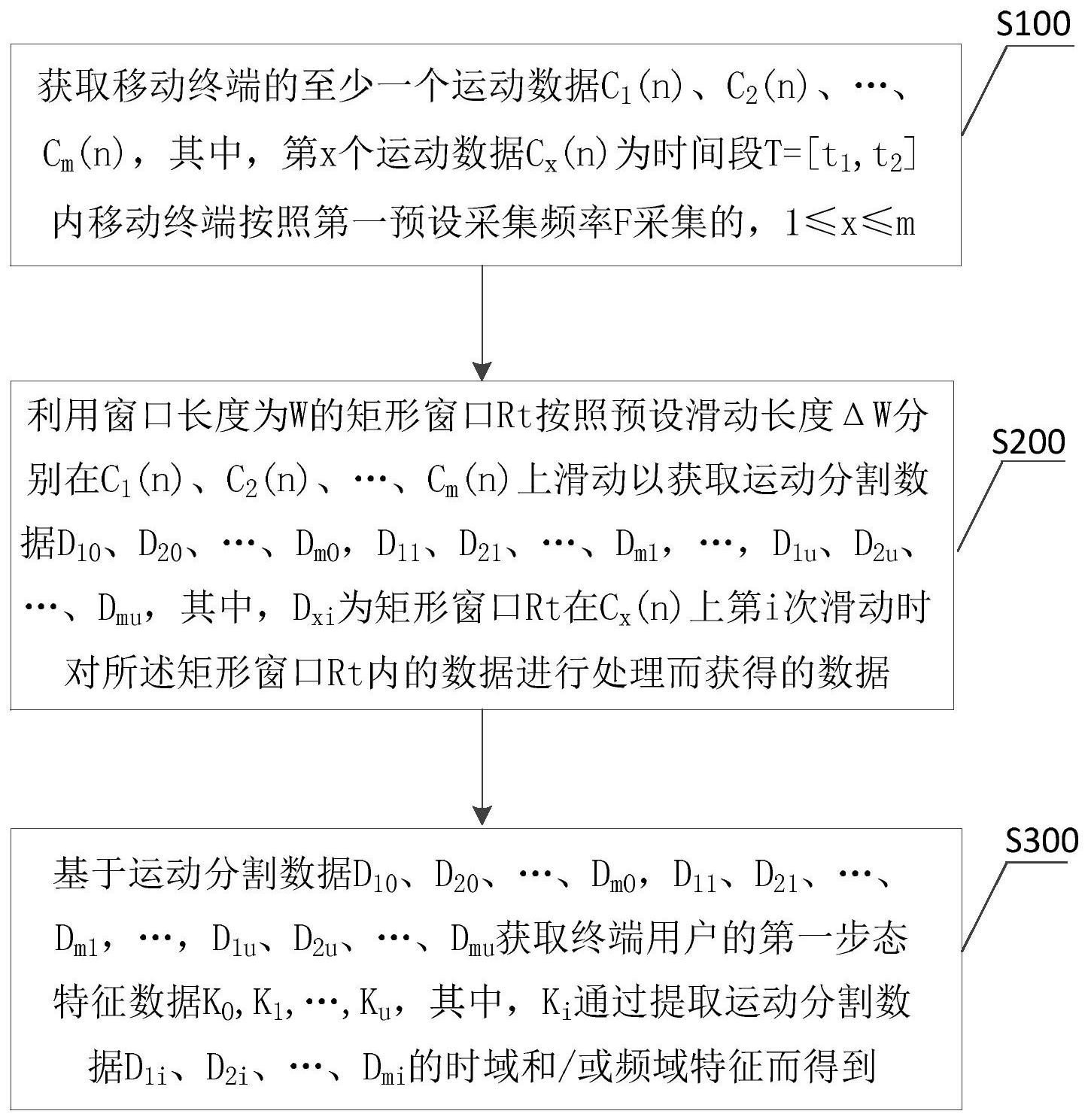 本发明涉及一种基于移动终端数据获取终端用户步态特征数据的方法,包括:获取移动终端的至少一个运动数据C1(n)、C2(n)、…、Cm(n),第x个运动数据Cx(n)为时间段T=[t1,t2]内移动终端按照第一预设采集频率F采集的;步骤200,利用窗口长度为W的矩形窗口Rt按照预设滑动长度ΔW分别在C1(n)、C2(n)、…、Cm(n)上滑动以获取运动分割数据D10、D20、…、Dm0,D11、D21、…、Dm1,…,D1u、D2u、…、Dmu,其中,Dxi为矩形窗口Rt在Cx(n)上第i次滑动时对所述矩形窗口Rt内的数据进行处理而获得的数据;步骤300,基于运动分割数据D10、D20、…、Dm0,D11、D21、…、Dm1,…,D1u、D2u、…、Dmu获取终端用户的第一步态特征数据K0,K1,…,Ku,其中,Ki通过提取运动分割数据D1i、D2i、…、Dmi的时域和/或频域特征而得到;进一步,W≥标准步态周期长度,所述标准步态周期长度为多个已知步态周期长度中的最大值。