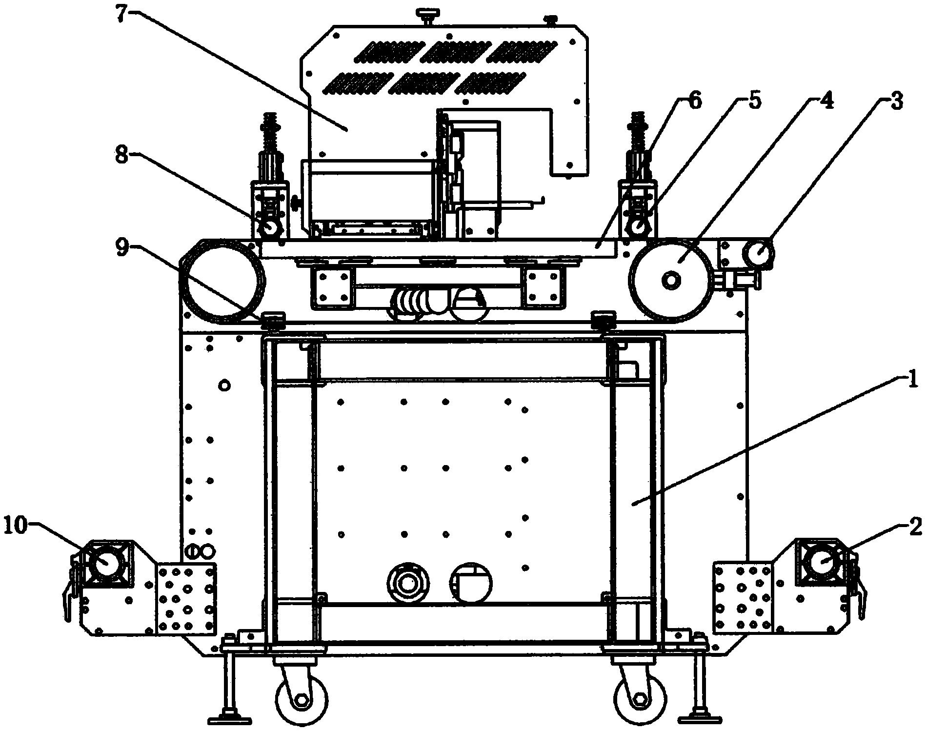 本实用新型涉及打印机设备技术领域,尤其为一种导带式打印机,包括机架、送料装置以及导带装置,所述机架上部螺栓连接有打印平台,所述打印平台上端螺栓连接有打印机头,所述打印平台内设有导带装置,所述导带装置包含张力调节装置、钢辊、导带和胶辊,且所述钢辊和胶辊上套设有导带,所述钢辊远离胶辊的一侧设有张力调节装置,所述导带装置上端靠近钢辊处设有后压料装置,所述导带装置上端靠近胶辊处设有前压料装置,所述导带装置靠近张力调节装置处设有托料装置,所述导带装置下端设有纠偏装置,所述机架两侧设有收料装置和送料装置,整体效果好,且稳定性和实用性较高,具有一定的推广价值。