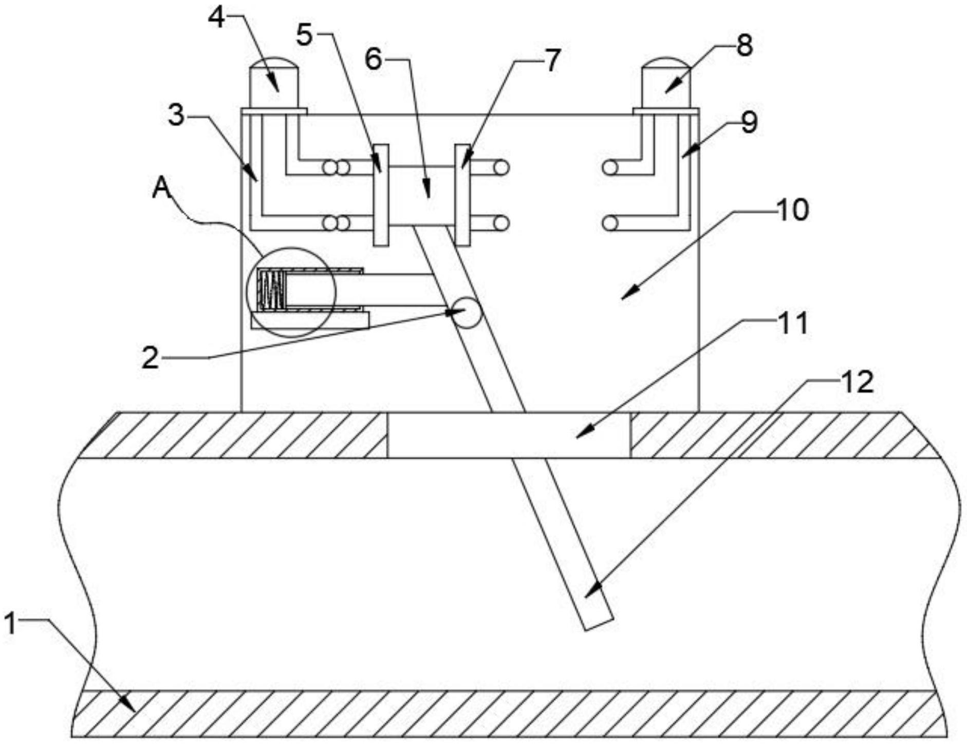 本实用新型涉及液体涂料喷枪技术领域,尤其涉及一种液体涂料喷枪堵塞报警装置。主要解决了现有的液体涂料喷枪在发生堵塞时不便于及时发现的问题。其技术方案包括:涂料喷枪管道及设于涂料喷枪管道外表面的安装块,安装块的一侧壁设有可转动的控制杆,控制杆的底端杆体插接至涂料喷枪管道的管道中,控制杆的顶端杆体设有连接块,连接块的两侧壁分别设有导电头A和导电头B,控制杆的顶部杆体的一侧壁设有活塞杆。本实用新型通过设置控制杆,依靠涂料喷枪管道内的液体流动控制控制杆的位置,从而控制导电头A、导电头B与电连接头A、电连接头B之间的连接状态,进而控制绿色指示灯以及红色报警灯的状态来警示工作人员。主要应用于涂料喷枪。