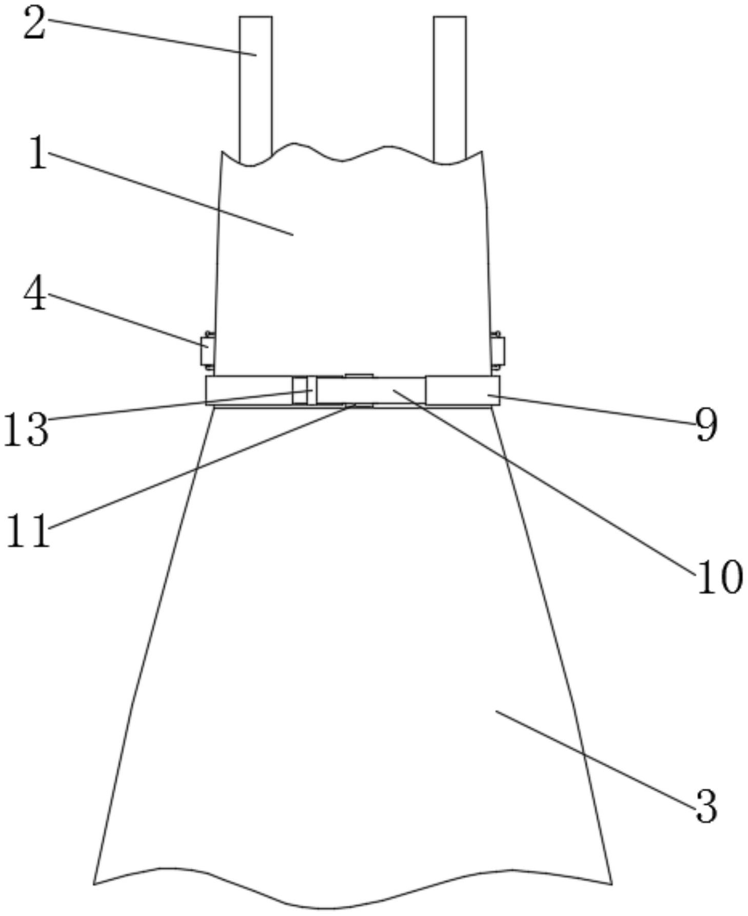 本实用新型属于服装技术领域,涉及一种可调节腰围的服装,包括上衣体、顶部吊带和裙摆,还包括第一调节带,所述顶部吊带固定连接在上衣体上端,所述顶部吊带共有两组,并且对称固定连接在上衣体上端,所述裙摆固定连接在上衣体下端,所述第一调节带固定连接在上衣体侧面。其有益效果是,该可调节腰围的服装,通过设置第一调节带和第二调节带,当人们需要对服装的腰围进行调节时,人们只需要拉动第一调节带,将第一调节带上合适位置的第一卡扣与第一卡块相扣合,然后将第二调节带上合适位置的第二卡扣扣合在第二卡块上,即可对服装的腰围进行双重调节,方便人们对服装的腰围进行调节。