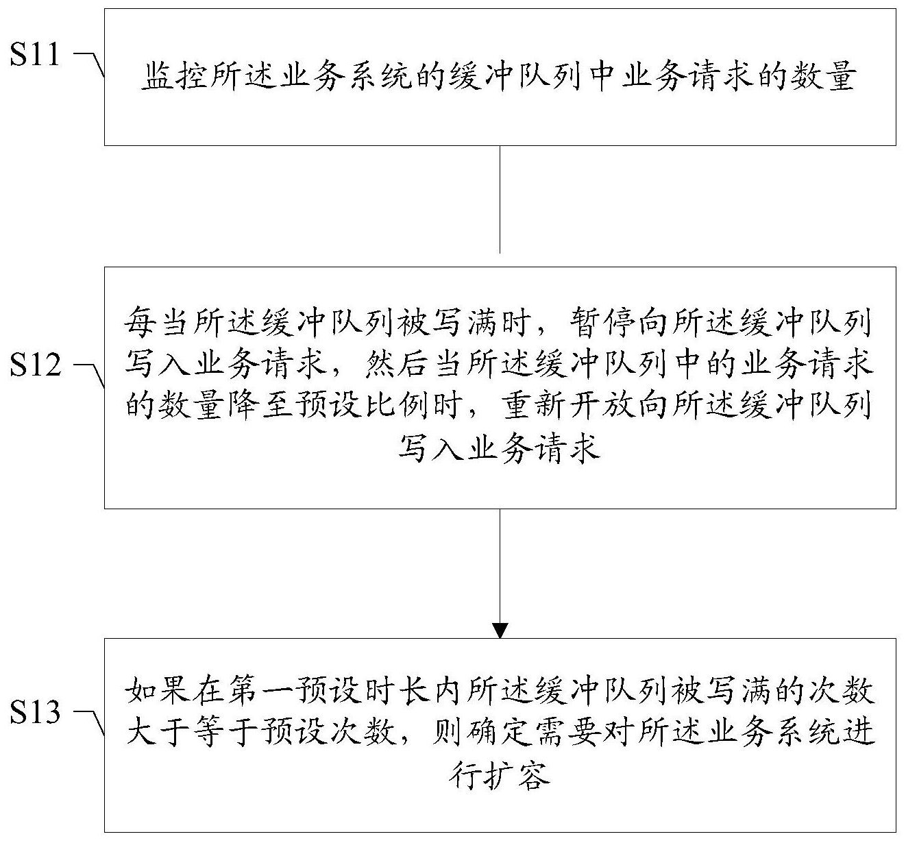 一种业务系统的扩容方法及装置、可读存储介质、终端,所述方法包括:监控所述业务系统的缓冲队列中业务请求的数量;每当所述缓冲队列被写满时,暂停向所述缓冲队列写入业务请求,然后当所述缓冲队列中的业务请求的数量降至预设比例时,重新开放向所述缓冲队列写入业务请求;当在第一预设时长内所述缓冲队列被写满的次数大于等于预设次数时,确定需要对所述业务系统进行扩容。本发明可以在节省资源和满足峰值访问、降低系统的运维压力之间达到平衡。