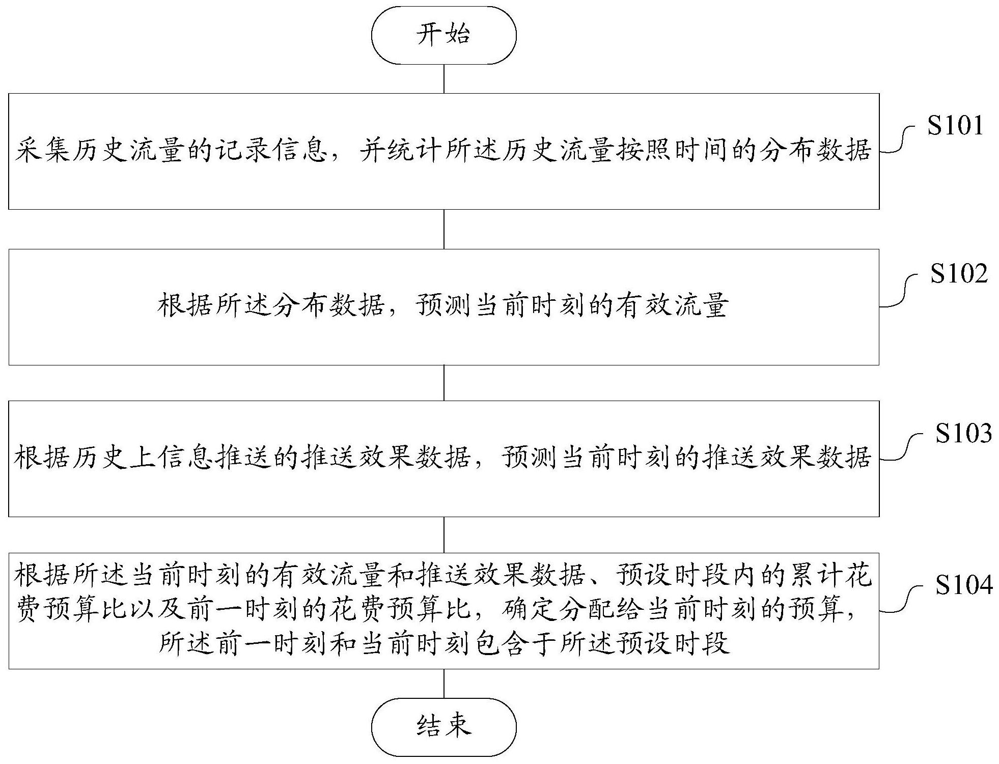 一种用于DSP平台的预算数据处理方法及装置、存储介质、终端,所述方法包括:采集历史流量的记录信息,并统计所述历史流量按照时间的分布数据;根据所述分布数据,预测当前时刻的有效流量;根据历史上信息推送的推送效果数据,预测当前时刻的推送效果数据;根据所述当前时刻的有效流量和推送效果数据、预设时段内的累计花费预算比以及前一时刻的花费预算比,确定分配给当前时刻的预算,所述前一时刻和当前时刻包含于所述预设时段。通过本发明提供的方案能够实现预算的平滑分配,从而在获得高质量的流量的同时,兼顾预算的消耗情况和信息的推送效果。