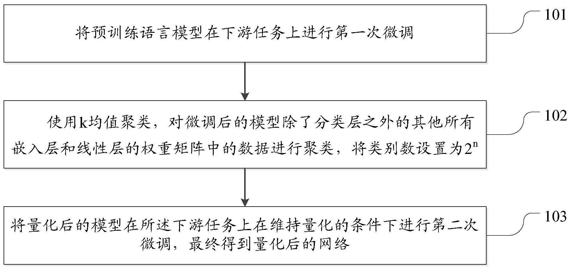 本发明公开预训练语言模型量化方法和装置,其中,一种预训练语言模型量化方法,包括:将预训练语言模型在下游任务上进行第一次微调;使用k均值聚类,对微调后的模型除了分类层之外的其他所有嵌入层和所有线性层的权重矩阵中的数据进行聚类,将类别数设置为2n,其中,n为压缩后目标模型每个数据所占的比特数;将量化后的模型在所述下游任务上在维持量化的条件下进行第二次微调,最终得到量化后的网络。本申请实施例提供的方案表明了底层的量化方案的提升对量化效果的影响被大大的低估和忽视了;同时也表明了简单的不使用任何技巧的k均值量化就可以达到非常好的压缩效果,说明k均值压缩方法有非常大的发展空间和应用前景。