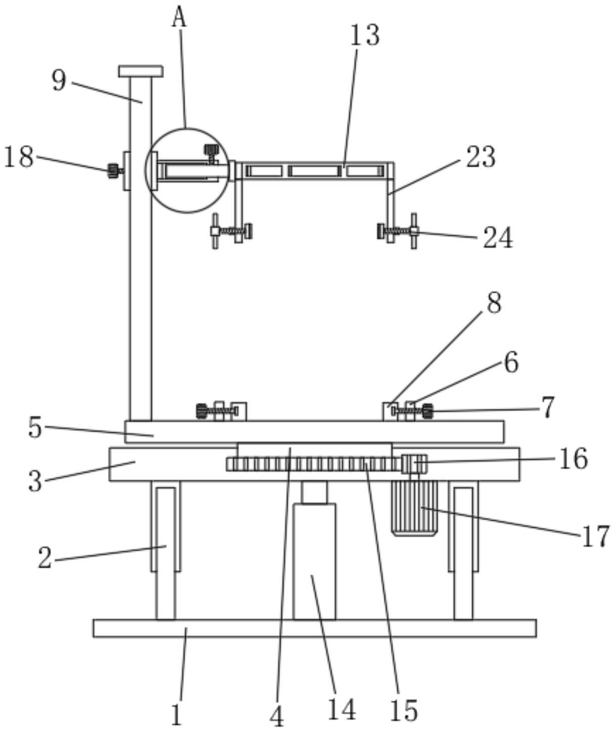 本实用新型涉及一种工业用组装工作台,包括底板,所述底板上方一周设有若干伸缩杆,所述伸缩杆顶端固定连接有支撑台,所述支撑台上方中心嵌入连接有转动座,所述转动座上方与工作台固定连接,所述工作台上方一侧设有定位板,所述定位板内部连接有螺杆一,所述螺杆一一端与夹板一连接,所述螺杆一相邻一侧位于所述工作台上方边缘设有支撑杆。本实用新型通过设置可以转动的工作台,方便调节服务机器人的角度,并且支撑杆上设有滑动座,滑动座可以带动定位环上下移动调节高度,从而可以调节对服务机器人上方区域的固定位置,进而可以对不同高度的机器人进行固定,提高组装工作台使用时的灵活性,方便工作人员操作和使用。