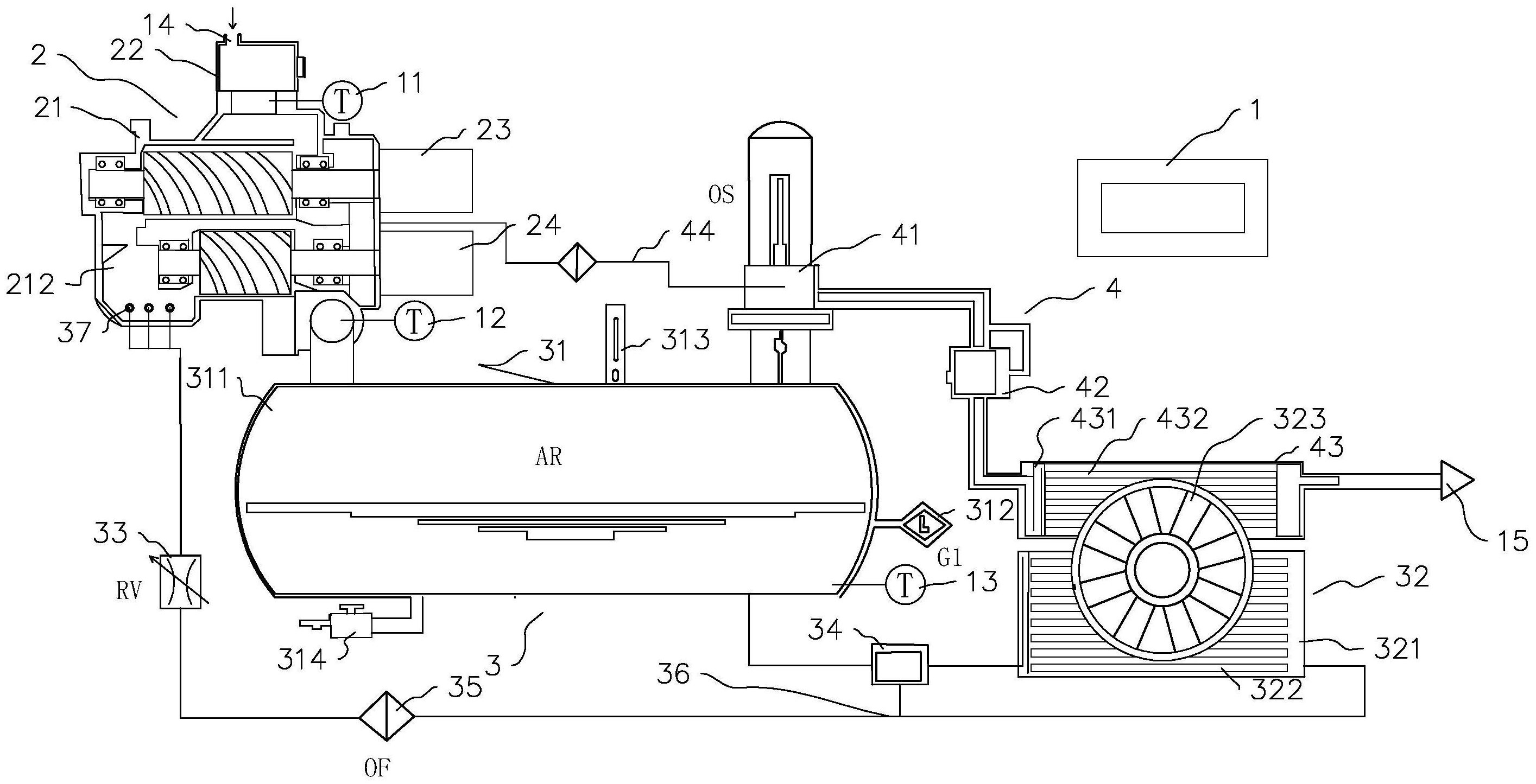 本发明公开了一种双级压缩机,涉及压缩机技术领域。其技术要点包括控制器、压缩机体和冷却润滑系统,所述压缩机本体包括连通的一级压缩腔、级间通道和二级压缩腔,所述机体的侧壁上开设有连通一级压缩腔的机体进气口和连通二级压缩腔的机体出气口,所述冷却润滑系统包括油气分离筒、回油管道以及流量控制阀;所述机体进气口设置有进气温度传感器,所述机体出气口上设置有出气温度传感器;所述控制器电连接进气温度传感器、出气温度传感器和流量控制阀,且所述控制器比较进气温度传感器和出气温度传感器输出的电信号,输出控制流量控制阀开度的电信号,本发明具有冷却温度可控,能够达到等温压缩的优点。