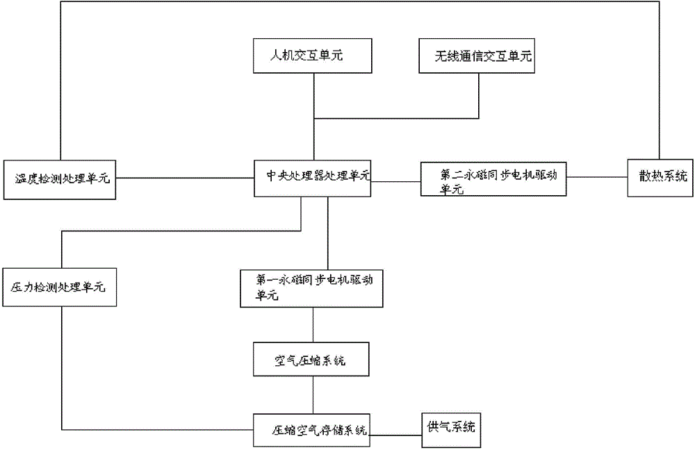 本实用新型公开了一种永磁同步电机驱动的螺杆式空气压缩机控制系统,包括人机交互单元,所述人机交互单元的输入输出端连接中央处理器处理单元,所述人机交互单元与中央处理器处理单元之间接有无线通信交互单元,所述中央处理器处理单元的输出端连接有温度检测处理单元,所述中央处理器处理单元的输入输出端还接有第一永磁同步电机驱动单元和第二永磁同步电机驱动单元,所述第一永磁同步电机驱动单元的输出端接一空气压缩系统,所述空气压缩系统的输出端接一压缩空气存储系统。本实用新型可以满足系统复杂的控制要求,又能够较大幅度地降低控制部件的成本,提高控制系统的集成度,设计合理、实时性强、性能稳定。