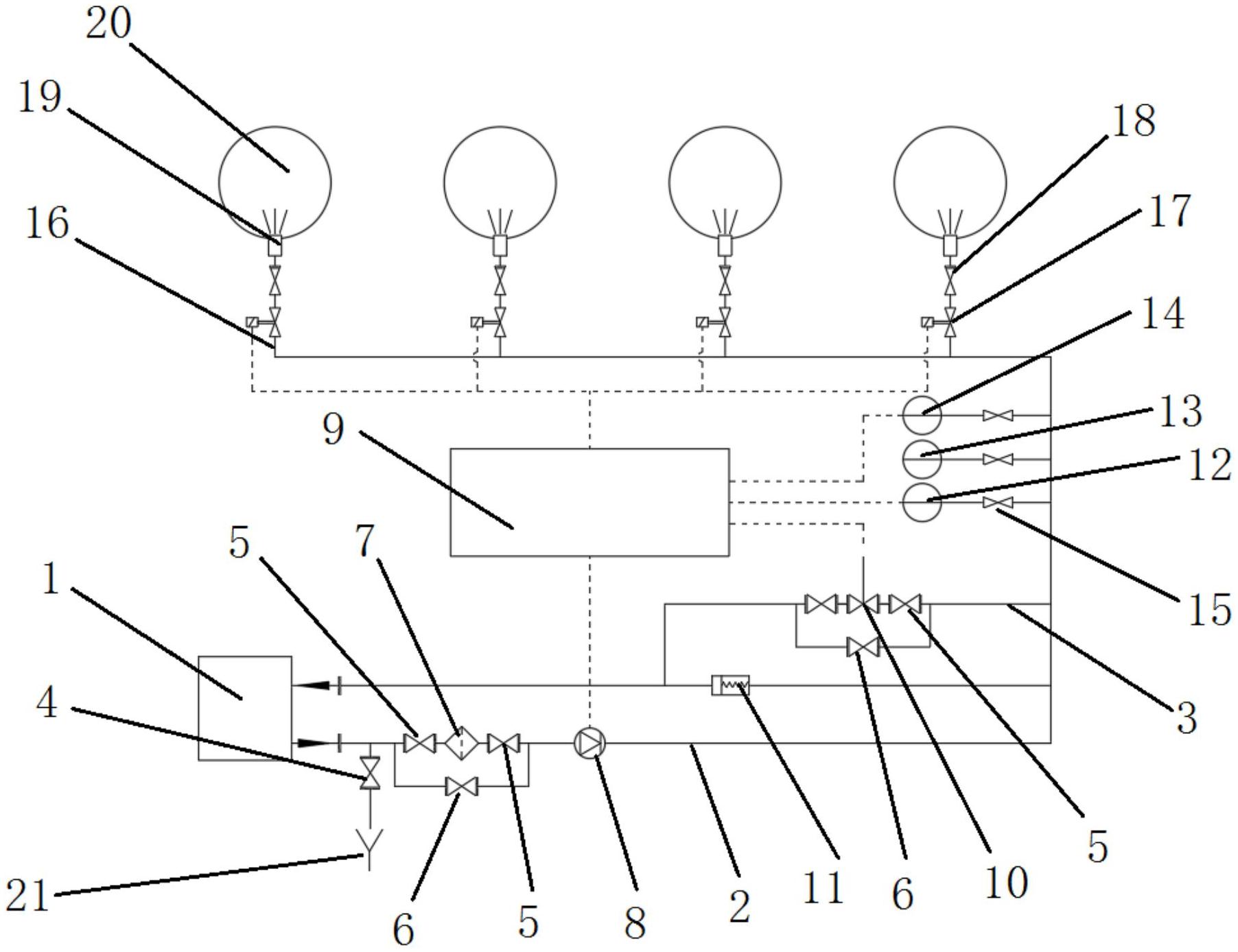 本实用新型涉及一种离心空压机用叶轮在线清洗系统,它包括:水箱、与所述水箱相连的主流道、与所述主流道相连且延伸至所述水箱内的回流道、连接在所述主流道上的水泵、与所述水泵电性相连的PLC控制器、连接在所述回流道上且与所述PLC控制器电性相连的电动调节阀、连接在所述主流道末端的辅流道、连接在所述副流道上且与所述PLC控制器电性相连的电磁阀、与所述电磁阀相连的止回阀、与所述止回阀相连的喷嘴以及连接在所述喷嘴上的叶轮进气管;本实用新型在机器运行过程中通过PLC控制器控制叶轮清洗系统自动清洗叶轮上的污垢,延长了离心空压机的运行寿命,可让机器保持良好的运行效率,不停机清洗也不会影响工作周期,不会影响施工效率。