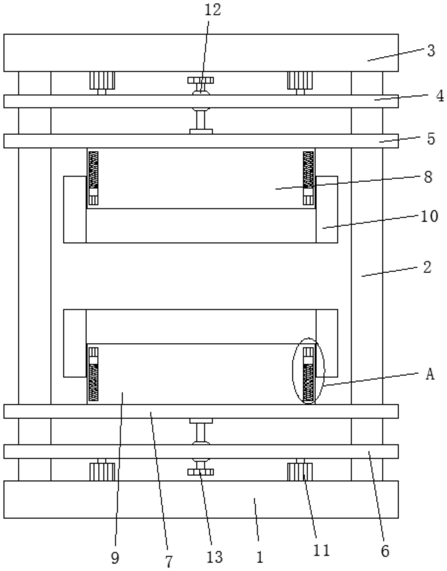 本实用新型涉及一种全自动正负压成型机的夹模装置,包括底座,所述底座的顶端四角处均固定设有滑杆一,所述滑杆一的顶端固定连接有顶板,所述滑杆一的上部滑动套设有上固定板和上安装板,所述上安装板位于所述上固定板的下方,所述滑杆一的下部滑动套设有下固定板和下安装板,所述下安装板位于所述下固定板的上方,所述上安装板的底端固定设有上模座本体,所述下安装板的顶端固定设有与所述上模座本体相匹配的下模座本体,本实用新型方便对模具进行高度调节,从而可以有效的保证模具之间的紧密型,同时通过壳体可以对物料夹持固定,从而保证模具对物料夹模时,物料出现褶皱的现象发生,进而可以有效的提高装置的生产质量和生产效率。