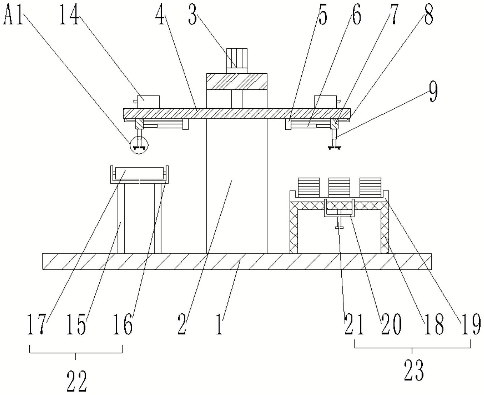 本实用新型涉及下料装置技术领域,公开了一种全自动成型机的旋转堆叠下料装置,包括底座,底座一侧表面固定安装有L型结构的支板,所述支板水平段固定安装有输出轴指向底座的旋转动力件,旋转动力件输出端固定安装有转盘,所述转盘靠近底座的表面固定安装有多组围绕转盘轴线呈圆形阵列分布的侧板,侧板外侧表面固定安装有第一伸缩件,第一伸缩件输出端固定安装有移动板。与现有技术相比,本实用新型的有益效果是:能够根据物料的形状对不同的位置进行吸附,实现多点吸附物料,提高吸附的稳定性,实现物料的持续吸附与堆叠放置,不同堆叠区域对应不同的堆叠部件,从而保证堆叠时的稳定和整齐,提高物料堆叠的效率,有利于使用。