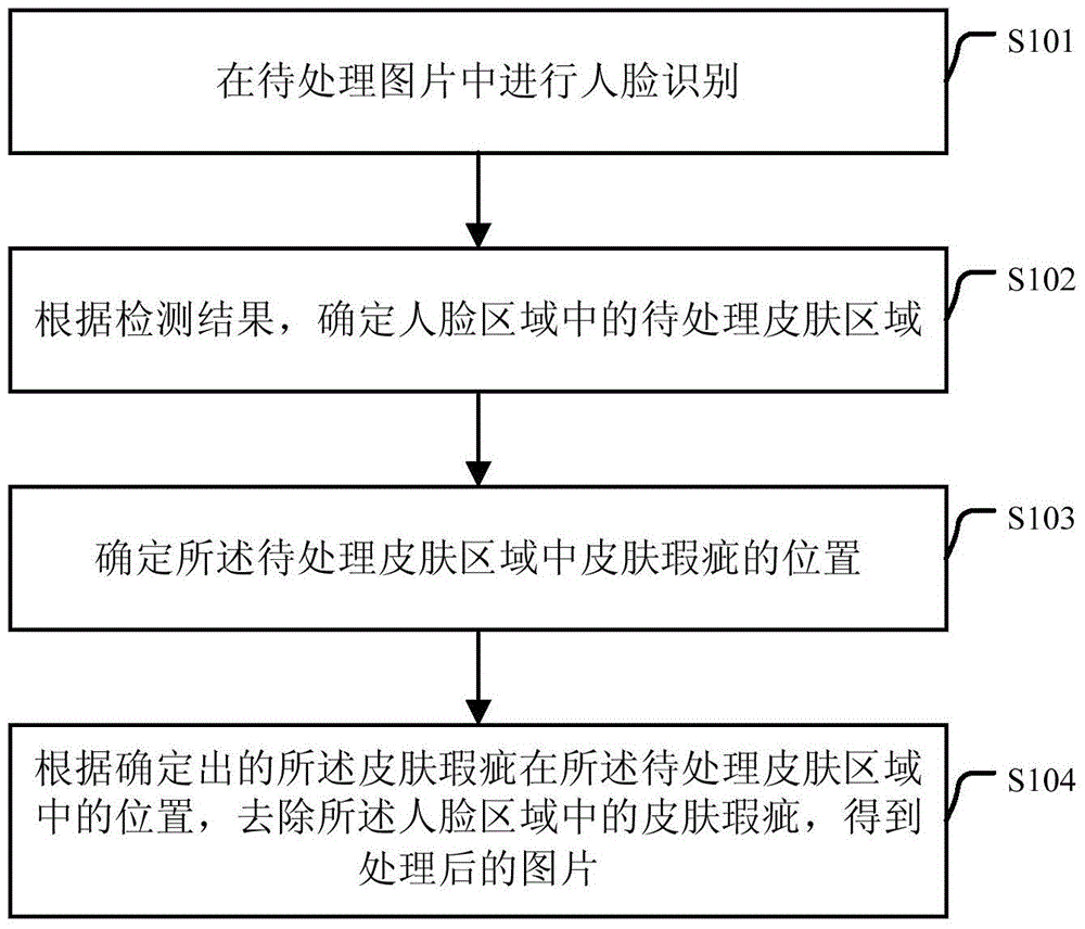 本发明公开了图片处理方法及装置,所述方法包括:在待处理图片中进行人脸识别;根据检测结果,确定人脸区域中的待处理皮肤区域;确定所述待处理皮肤区域中皮肤瑕疵的位置;根据确定出的所述皮肤瑕疵在所述待处理皮肤区域中的位置,去除所述人脸区域中的皮肤瑕疵,得到处理后的图片。能够自动地对照片图像中人的皮肤进行修改,即消除了皮肤中较浅的瑕疵,也消除了皮肤中比较明显的问题。相对于现有的皮肤美化处理的各类APP中手动抹除皮肤瑕疵的方案,本申请所提供的方法给用户提供了更好的用户的体验。