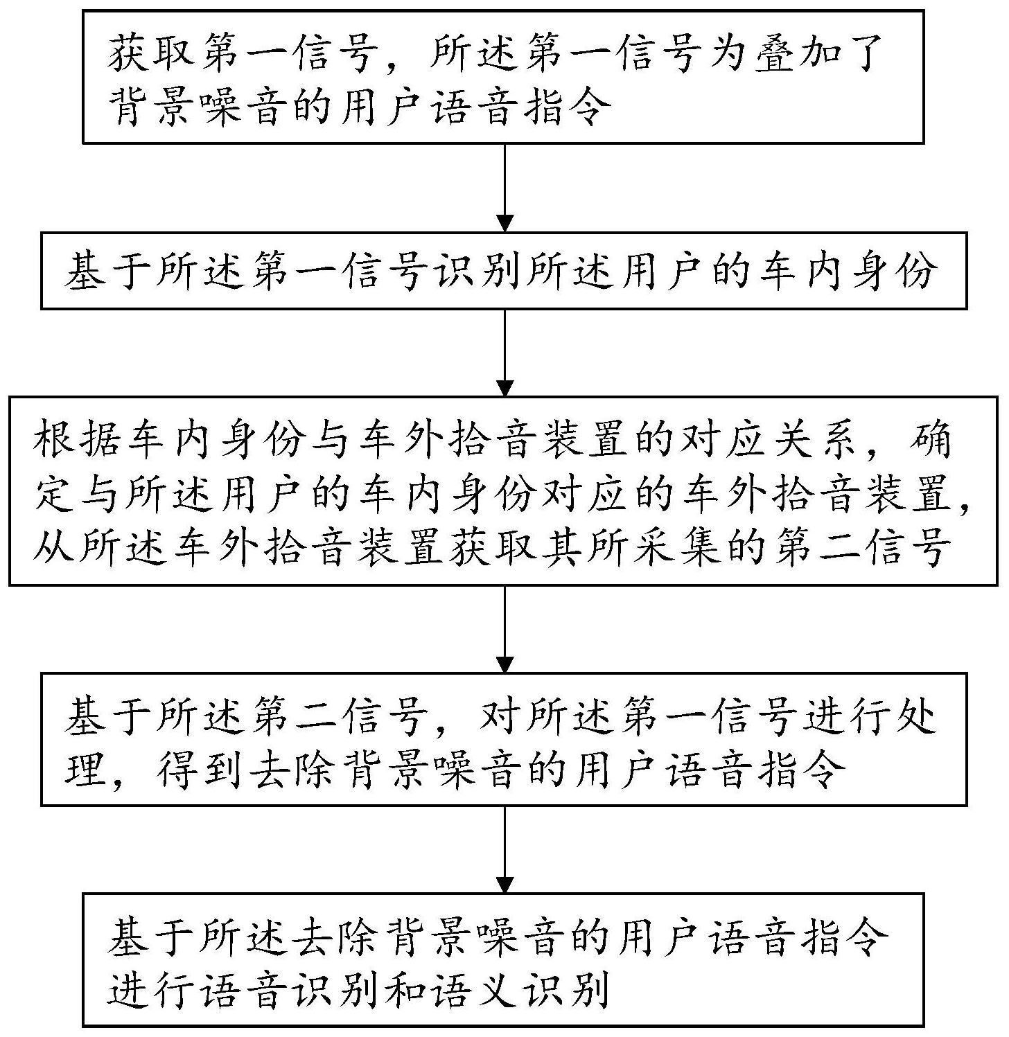 本发明公开了一种语音指令识别方法、装置及系统,所述方法包括:步骤101,获取第一信号,所述第一信号为叠加了背景噪音的用户语音指令;步骤102,基于所述第一信号识别所述用户的车内身份;步骤103,根据车内身份与车外拾音装置的对应关系,确定与所述用户的车内身份对应的车外拾音装置,从所述车外拾音装置获取其所采集的第二信号;步骤104,基于所述第二信号,对所述第一信号进行处理,得到去除背景噪音的用户语音指令;步骤105,基于所述去除背景噪音的用户语音指令进行语音识别和语义识别。通过本发明的方法,避免了开窗时车外噪声导致的语音指令无法识别或者识别错误的情况,提高了语音指令识别率,提升了用户体验。