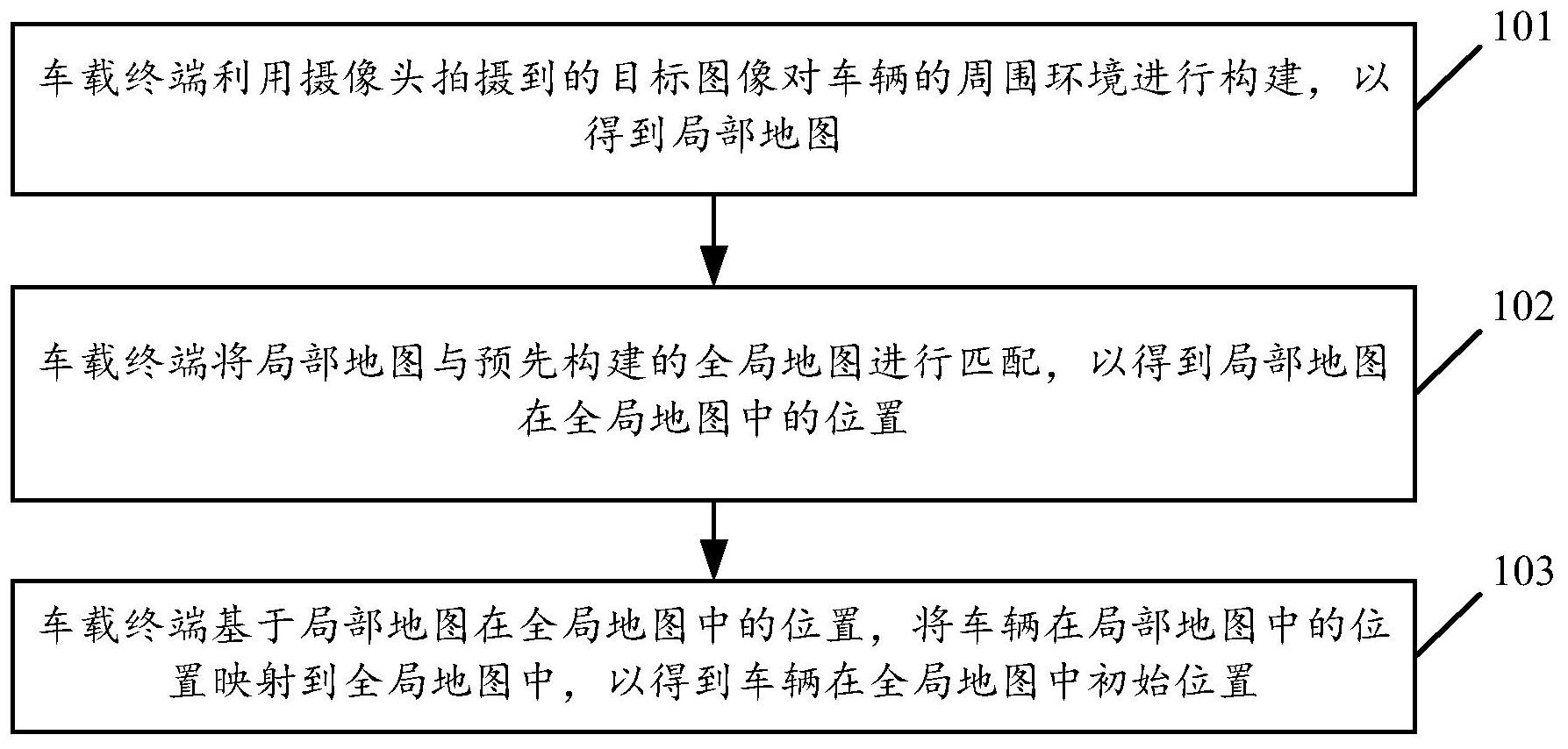 一种特殊环境下的定位初始化方法及车载终端,该方法包括:利用图像采集装置拍摄到的目标图像对车辆的周围环境进行构建得到局部地图;将所述局部地图与预先构建的全局地图进行匹配,以得到所述局部地图在所述全局地图中的位置;基于所述局部地图在所述全局地图中的位置,将所述车辆在所述局部地图中的位置映射到所述全局地图中,以得到所述车辆在所述全局地图中初始位置。此外,针对多张目标图像进行拼接识别所述俯视拼接图中的图像语义特征,以得到所述俯视感知图;基于所述俯视感知图进行定位,从而确定关键帧;根据所述关键帧生成地图点,从而形成局部地图。实施本发明实施例,可以在GPS信号等位置先验信息缺失的情况下,利用图像采集装置拍摄到的图像数据确定出车辆在全局地图中的初始位置。通过关键帧生成地图点形成的局部地图,能够建出稠密而准确的地库地面元素,并且更为鲁棒,精确。