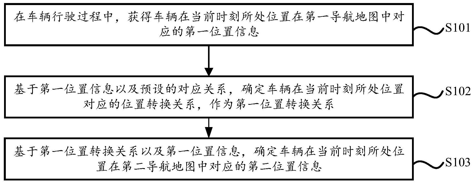 本发明实施例公开一种位置信息确定方法及装置,该方法包括:在车辆行驶过程中,获得车辆在当前时刻所处位置在第一导航地图中对应的第一位置信息,其中,第一导航地图为:用于标识指定场景中各位置的位置信息的地图;基于第一位置信息以及预设的对应关系,确定车辆在当前时刻所处位置对应的位置转换关系,作为第一位置转换关系,其中,预设的对应关系包括:指定场景的多个指定区域在第一导航地图中对应的位置信息,与在第二导航地图中对应的位置信息之间的位置转换关系;基于第一位置转换关系以及第一位置信息,确定车辆在当前时刻所处位置在第二导航地图中对应的第二位置信息,以实现两个地图之间位置信息的较准确的转换。