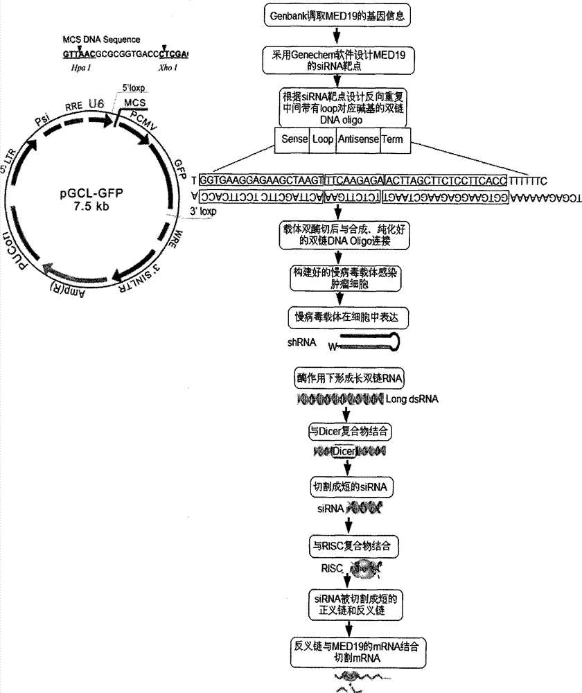 本发明属于生物技术领域,具体涉及人MED19基因在肿瘤治疗中的新用途。现研究表明MED19在肿瘤发生发展中具有重要的生物学功能,与正常组织相比,MED19基因在肿瘤组织中广泛高表达。针对人MED19基因设计的RNA干扰慢病毒,特异干扰并下调MED19基因的表达后,可以抑制肿瘤细胞的生长、侵袭,促进肿瘤细胞的凋亡、抑制肿瘤细胞成瘤。MED19基因可以作为肿瘤治疗的分子靶标。针对MED19基因的siRNA沉默可作为肿瘤治疗的一种新型工具。