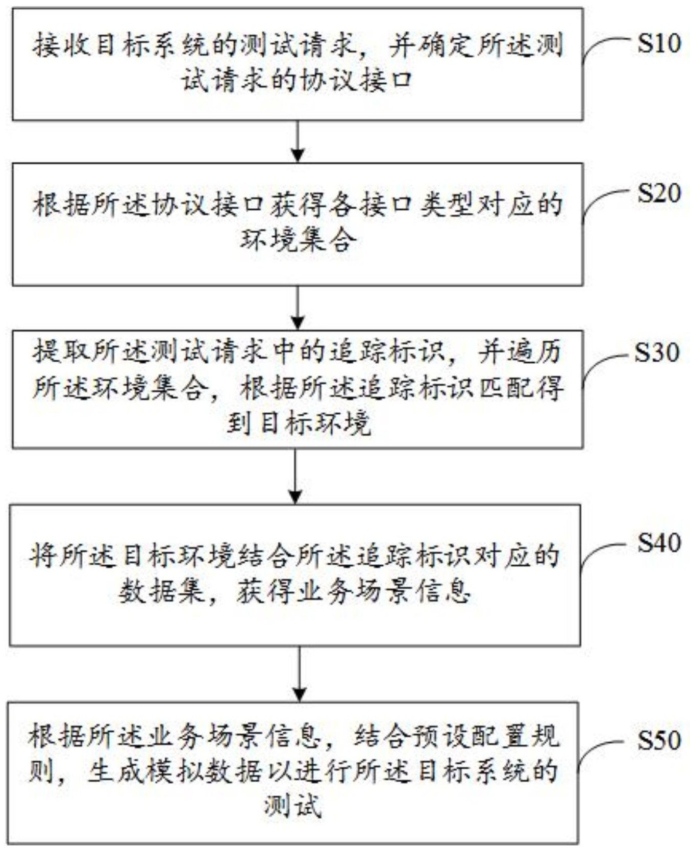 本发明涉及数据测试领域,公开了一种系统测试方法、装置、设备及存储介质,该方法包括:接收目标系统的测试请求,并确定测试请求的协议接口;根据协议接口获得各接口类型对应的环境集合;提取测试请求中的追踪标识,并遍历所述环境集合,根据追踪标识匹配得到目标环境;将目标环境结合所述追踪标识对应的数据集,获得业务场景信息;根据业务场景信息,结合预设配置规则,生成模拟数据以进行目标系统的测试。由于本发明中基于不同的协议类型获取场景信息进行规则配置化,获得用于测试的模拟数据,能根据不同的请求入参条件进行场景匹配,从而更精确地模拟整个流程的系统模块交互,提高了系统测试的准确率。