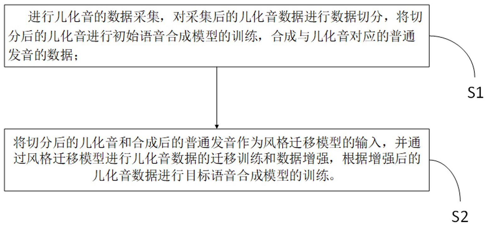 本发明涉及一种儿化音合成方法、装置、电子设备及存储介质,包括如下步骤:包括如下步骤:S1:进行儿化音的数据采集,对采集后的儿化音数据进行数据切分,将切分后的儿化音进行初始语音合成模型的训练,用于合成与儿化音对应的普通发音的数据;S2:将切分后的儿化音和合成后的普通发音作为风格迁移模型的输入,并通过风格迁移模型进行儿化音数据的迁移训练和数据增强,根据增强后的儿化音数据进行目标语音合成模型的训练。本发明提供的儿化音合成方法、装置、电子设备及存储介质,通过风格迁移模型构造足够多的儿化音数据,随后再用于语音合成模型进行儿化音数据的合成和语音转换,提高语音合成的系统鲁棒性。