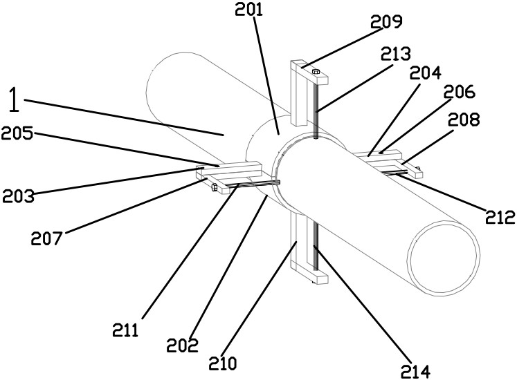 本实用新型公开了一种装配式管桁架拼装调节装置,包括圆柱形的主管及通过螺栓固定套设在主管上的卡具,所述卡具在水平方向和垂直方向分别对称设置有两个调节螺栓架,所述调节螺栓架上设置有调节螺栓。所述卡具包括上卡具和下卡具,所述上卡具水平方向分别对称设置有固定卡具板,所述下卡具水平方向分别对称设置有调节螺栓架,所述固定卡具板和调节螺栓架通过螺栓进行固定;所述上卡具与下卡具在垂直方向分别设置有1个调节螺栓架。本实用新型卡具可以根据钢管直径任意加工装置操作工艺简单,无危险性;在水平和竖直方向各设置2个调节螺栓,可以同时调节两个方向的对接口位移,提高管桁架对接口拼装精度,同时提高调节效率。