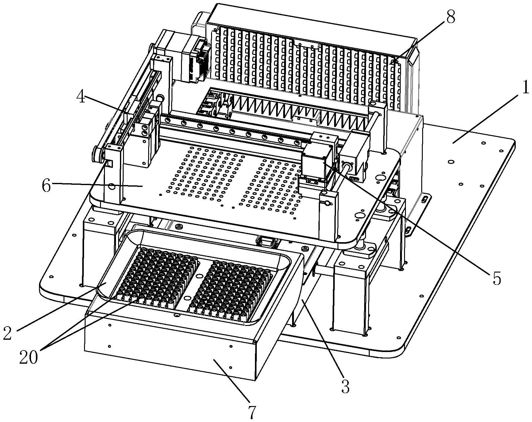 本实用新型公开了一种192孔高通量实时荧光PCR装置,包括一底座、一样本载台、一抽拉机构、一XY轴水平面位移机构、一荧光采集模块、一加热盖和一降温机构。本实用新型是对传统96孔PCR进一步改进,在保证反应体积能达到200uL的前提下,将传统的96反应孔倍增,采用192孔同时进行PCR反应实验,每个孔即相对独立,又能保持每个孔温度偏差在合理范围,并可兼容现有的单管、8联管、12联管和96孔板。