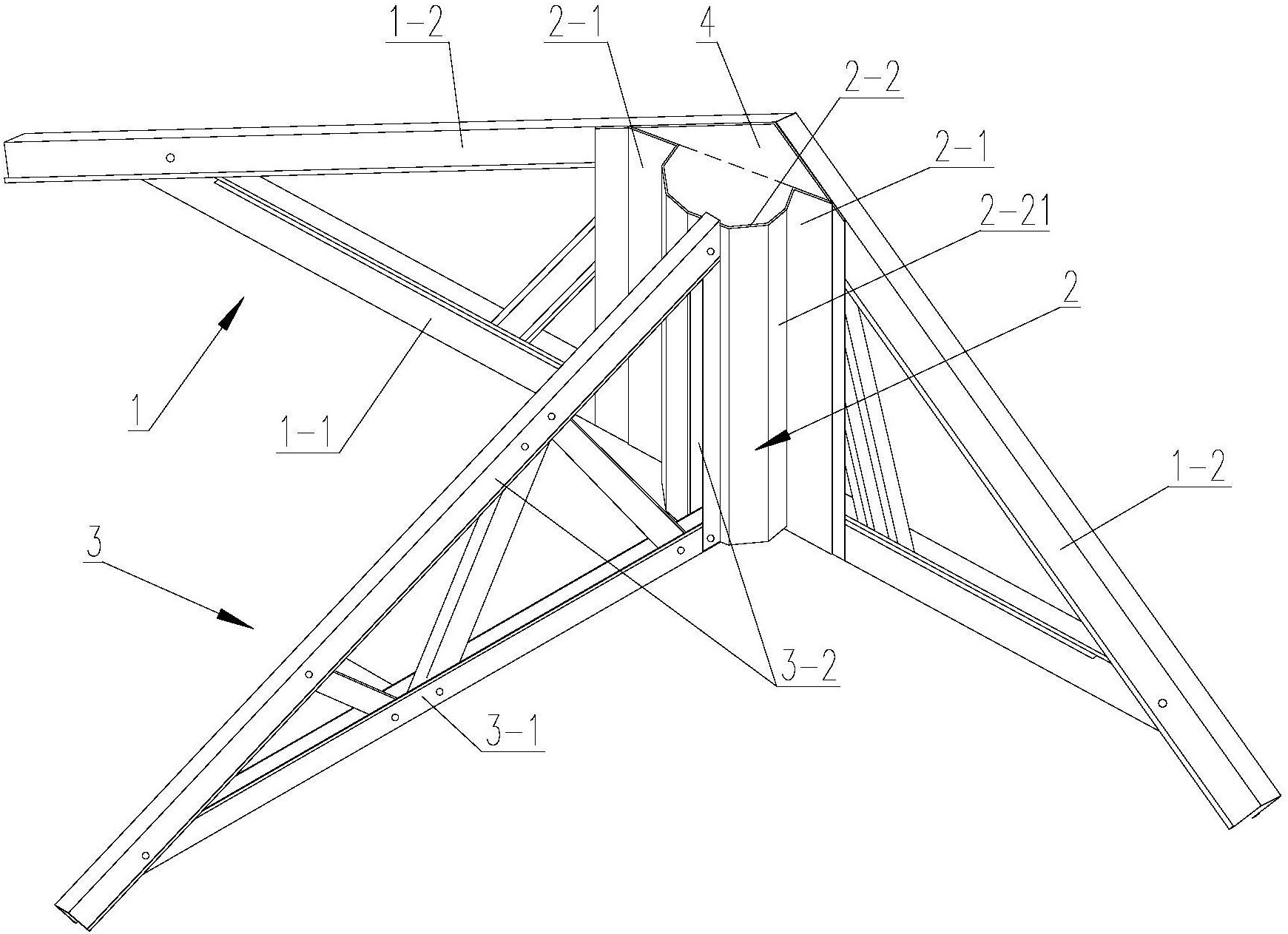 本实用新型涉及钢结构房屋技术领域,尤其是一种锥形屋顶构架,包括主屋架、连接件及副屋架;连接件有两个,连接件的外周面上具有多个供副屋架连接的安装平面,连接件的两端均向外设有侧翼;两个连接件对称安装在主屋架的两侧,连接件通过其两端的侧翼安装在主屋架上;副屋架有多个,每个副屋架单独安装在一个安装平面上,副屋架的内侧端部贴合在安装平面上,位于主屋架同一侧的相邻两个副屋架之间的夹角相等,两个连接件上和主屋架相邻的副屋架与主屋架之间的夹角相等,通过连接件的设置及其安装平面的设置,使得副屋架在主屋架上快速定位,施工快捷,且还能提高副屋架与主屋架的连接强度,整体的屋顶顶构架强度高,稳定性好。