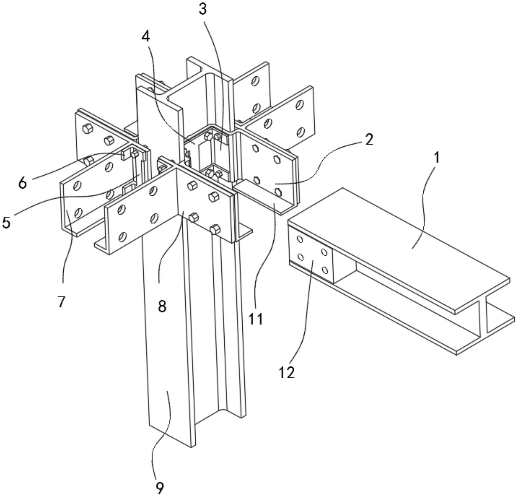 本实用新型公开了一种横梁与纵梁交叉拼接的高强度连接结构,涉及钢结构连接件技术领域,具体包括两个U型板,U型板分别放置在工字架内顶部两侧;U型板的两端连接有第一支撑板,第一支撑板和U型板末端之间阶梯设置;第一支撑板靠近U型板的一侧均垂直连接有第三支撑板,第三支撑板之间、以及第一支撑板之间均用于放置工字梁。与现有技术相比,本实用新型在使用时,将U型板置于工字架内,然后将分布在工字架侧面上的工字梁置于支撑板之间后通过螺栓紧固即可,方便安装和拆卸。
