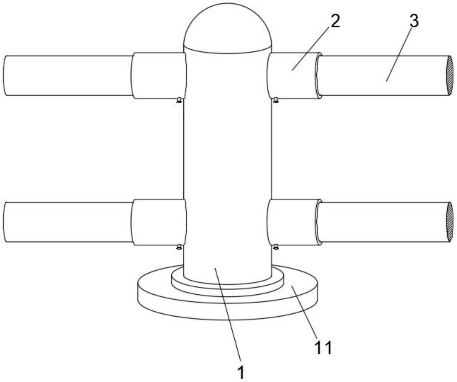 本实用新型公开了一种护栏接头连接结构,包括立柱,用于对多个护栏进行连接固定,所述立柱的侧壁对称固定连接有多个连接筒,便于对连接杆进行连接固定,多个所述连接筒的内底部靠近端面位置均固定连接有滑轨,便于连接杆的插入,从而对其进行连接固定,多个所述连接筒的内部均设置有连接杆,多个连接杆和立柱进行连接形成护栏,多个所述连接杆的底部靠近端面位置均开设有滑槽,便于连接杆的定位滑动,多个所述滑槽的内顶部靠近端面位置均开设有卡槽。本实用新型通过在立柱的连接头内设置有卡合机构,从而使得在对护栏进行安装时更加的便捷,不需要传统的螺栓对其进行固定,提高安装效率,同时方便拆卸对其进行位置的更换使用。