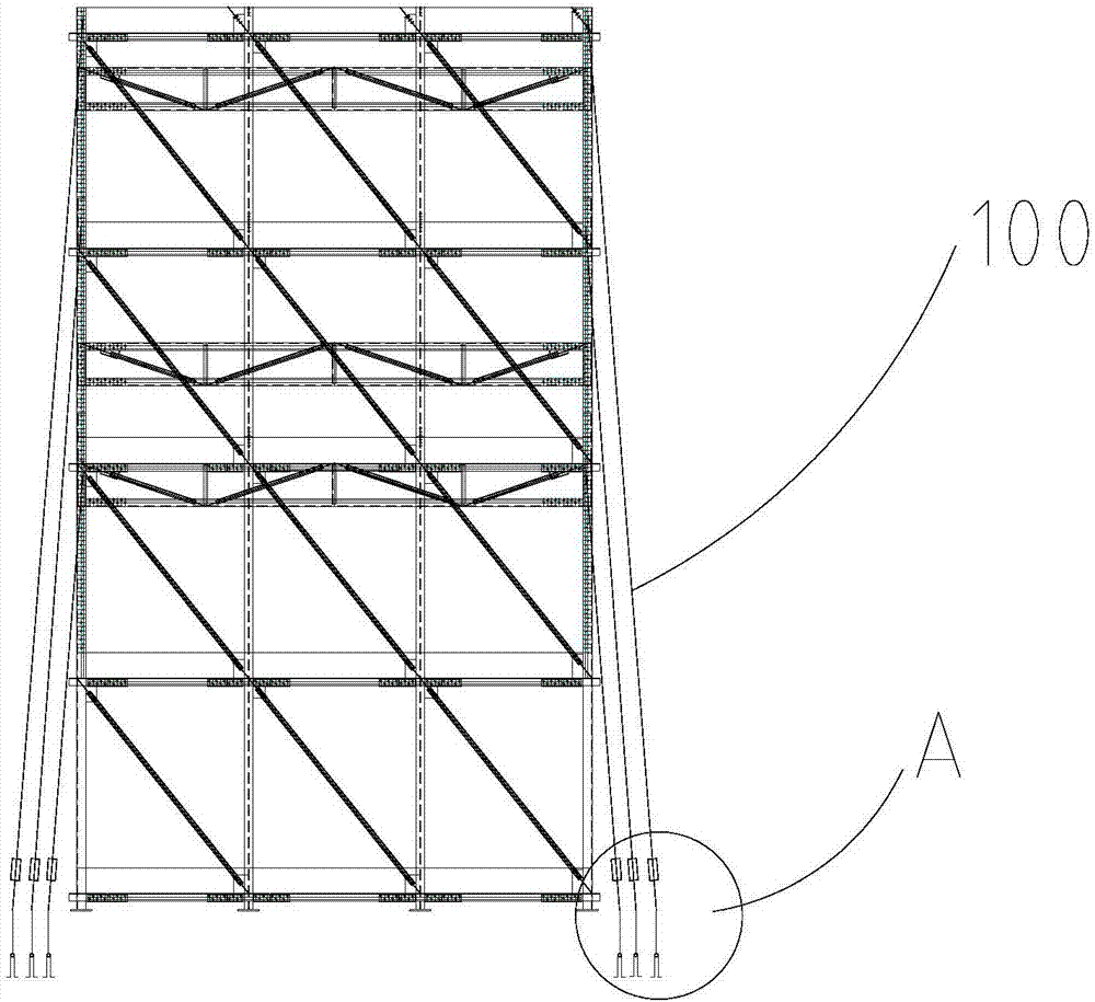 本实用新型涉及一种带抗风拉索的屋面板现场加工一体机。该一体机包括移动行走料架、上卷机、导向滑轮、卷扬机、双臂上料拨杆、固定提升支架、滑动提升托架、集装箱和压板机,还包括稳定装置;稳定装置包括可调节抗风拉索、限位装置,可调节抗风拉索包括第一钢丝绳、调节装置、第二钢丝绳及地锚;第一钢丝绳一端与固定提升支架连接,第一钢丝绳另一端与调节装置连接;调节装置用于调节抗风拉索拉力的松紧,调节装置连接第一钢丝绳及第二钢丝绳;第二钢丝绳不与调节装置连接的一端与地锚连接;限位装置用于限制第一钢丝绳与固定提升支架的连接处的位置变化。本实用新型通过稳定装置使带抗风拉索的屋面板现场加工一体机在施工现场拥有较好的稳定性。