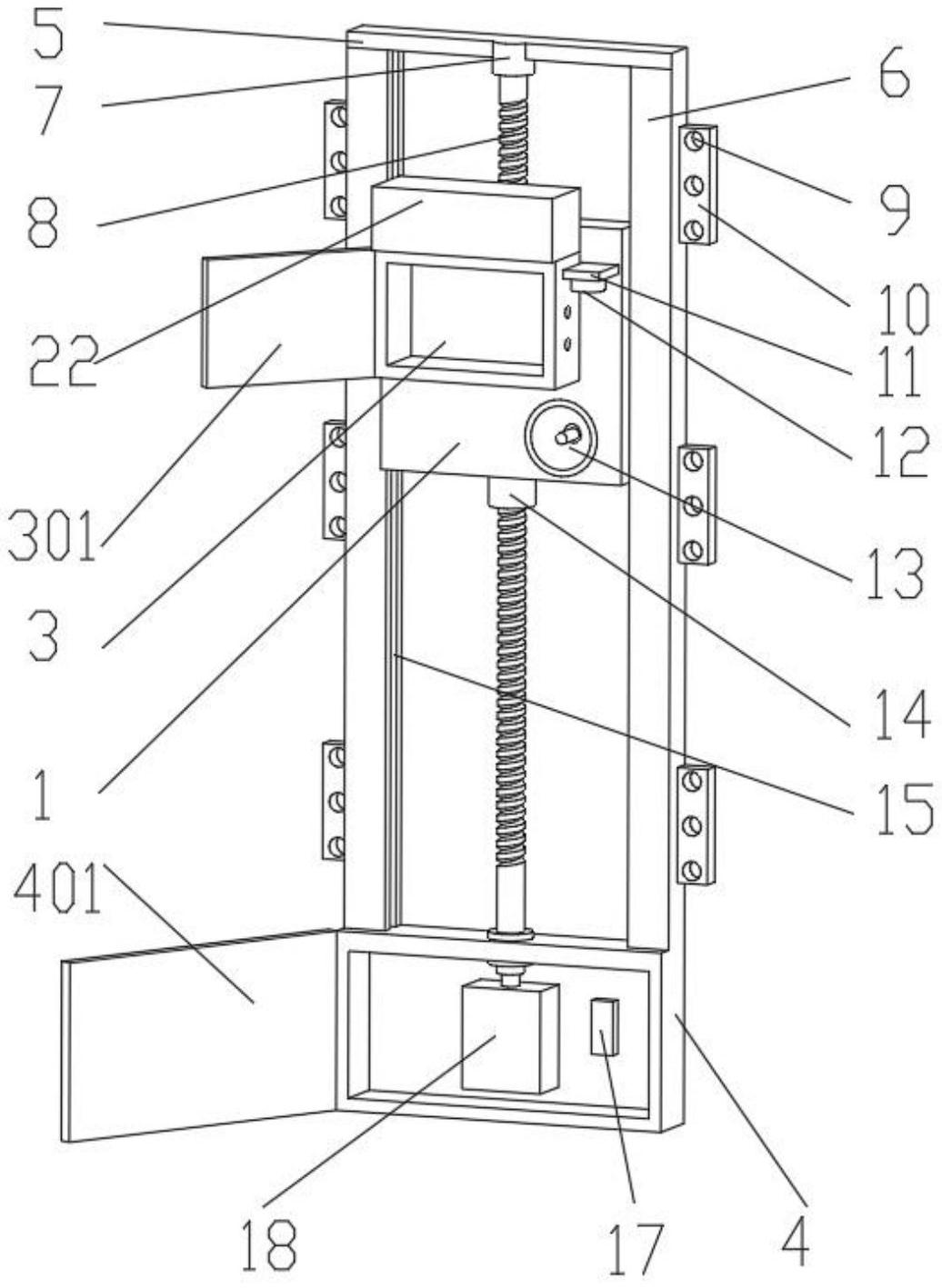 本实用新型公开了一种智能防火门监控器,涉及防火门技术领域,具体为一种智能防火门监控器,包括区域分机底座和控制箱,所述区域分机底座的背面固定连接有内螺纹管,所述内螺纹管的内部螺纹连接有螺纹柱,所述螺纹柱的上部转动连接有连接块,所述连接块的侧面固定连接有连接板,所述连接板的一侧固定连接有滑轨,所述滑轨的侧面开设有滑槽,所述螺纹柱的下端通过轴承固定连接有机箱,所述机箱的内部固定安装有电机。该智能防火门监控器,通过滑轨的设置,使该智能防火门监控器具备了便于检修维护的效果,通过内螺纹管和螺纹柱的配合设置,在使用的过程中可以使区域分机底座上下升降,达到了便于维护检修的目的。
