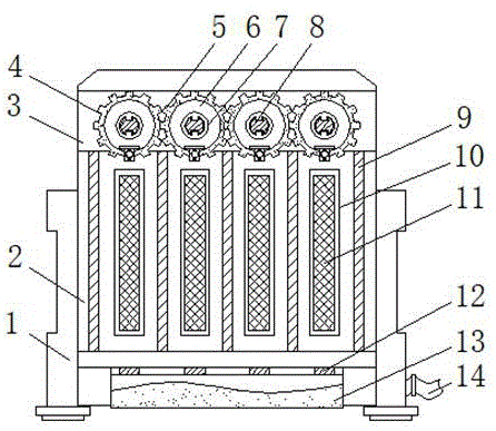 本实用新型公开了一种输液热敷贴用的加工装置,包括底座和加热腔,所述底座的上端安装有烘干主座,所述烘干主座内部的上端设置有收卷腔,所述烘干主座内固定有隔板,所述加热腔位于烘干主座内壁的正面,且加热腔的前端外壁设置有散热网板,所述底座的下端安装有接水腔,所述接水腔的右端设置有排水管。本实用新型中,通过收卷辊对布料夹持后,利用烘干主座对其烘干完成时通过电机带动主齿轮和副齿轮同时旋转,能够让收卷辊对烘干的布料进行同时收卷,进而再通过卡板将收卷辊拿取下来,这样使得装置能够对烘干后的布料自动收卷,大大减少工作强度,便于将布料进行统一收集存放,较为方便,能够节省时间。