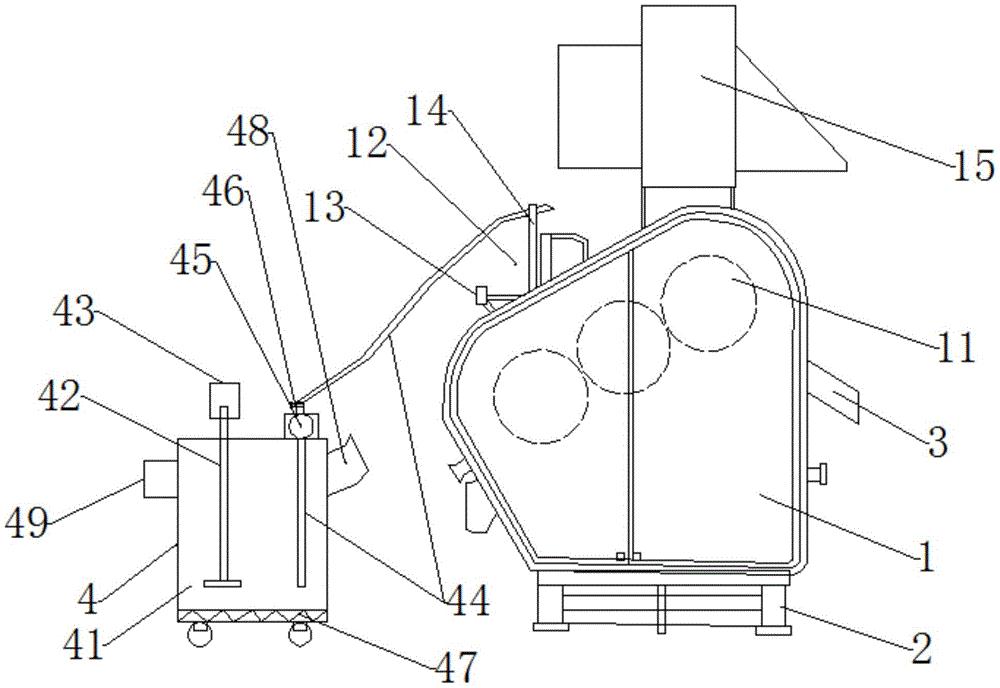 本实用新型公开了一种具有自动加料功能的三辊研磨机,所述研磨机包括机架,设置于机架下方的支撑脚,设置于机架上方的排气装置,设置于机架上的出料斗,设置于机架内部用于研磨的辊轴,还包括一自动加料装置,所述加料装置包括加料桶,设置于加料桶内部的搅拌装置,所述搅拌装置与电机连接,所述加料桶内还设置有出料管,所述出料管上连接的压力泵,所述出料管还与设置于研磨机上的出料管架连接固定,所述出料管架包括一横向的挡板、一竖向的出料管支撑架。本实用新型通过设置自动加料装置,使得整个研磨过程省时省力同时也节省了成本。