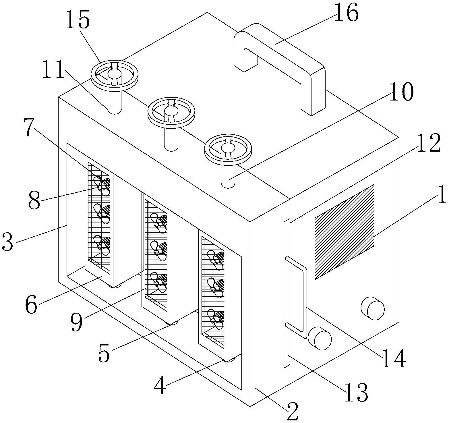 本实用新型公开了一种多通道风冷式高散热焊机,该焊机旨在解决现有技术的焊机缺少多通道的散热结构,散热风扇难以将热量大面积的带出焊机,需要散热风扇频繁启动,难以实现节能节电的技术问题。该焊机包括焊机本体和固定安装于所述焊机本体前端的固定体;所述固定体前后两端贯穿开设有第一槽体,所述固定体下端内壁固定开设有均匀分布的第二槽体,所述第二槽体内壁活动设置有第一转动柱,所述第一转动柱上端固定安装有固定框。该焊机利用多个固定框可充当多通道使用,固定框内设有多个第一散热风扇,在第一散热风扇和第二散热风扇的配合作用下,可利用风力将焊机内部的热气快速排出焊机,实现焊机的高效散热。
