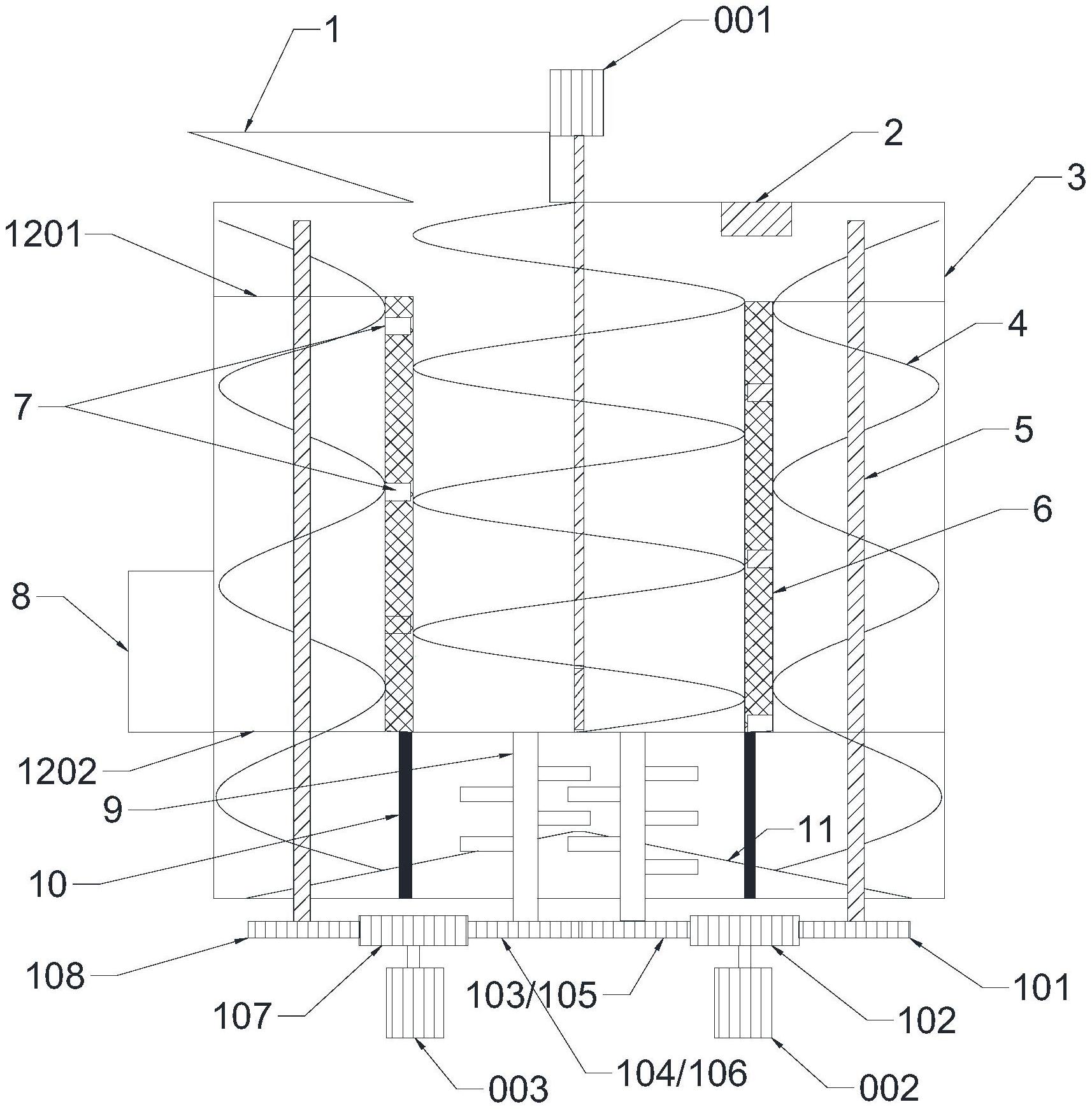 本实用新型公开了一种微波辅助粘结型建筑废弃骨料再利用设备,包括进料口、内筒、外筒和微波控制器。内筒通过若干支柱支撑于外筒的锥形过滤底面上。内筒为内分布有若干微波发生器,设置有螺旋传输面。外筒设置有搅拌破碎坤和小型螺旋传输面,上部设置有抽风口,外部设置有微波控制器。未到达分离破碎标准的物料,无法从锥形过滤底面排出,由外筒的小型的螺旋传输面再次传输进入内筒的微波辐射区,循环往复,直至从锥形过滤底面排出。该设备使用微波选择性加热的特性,利用不同物料间的温度梯度及膨胀性的差异,完成骨料分离,保证骨料的高效高质再回收。实现了资源的最大化利用,流程简单,适用于机械化作业。