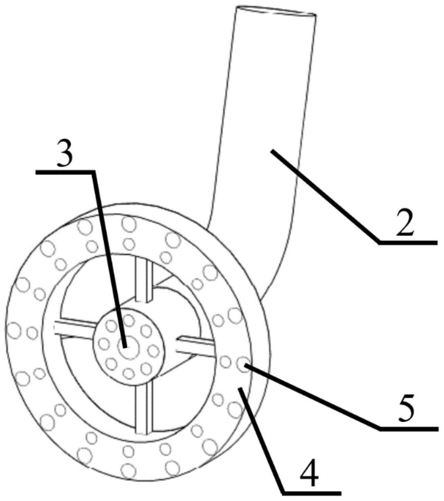 本实用新型公开一种天然气与氢气的混合装置,包括氢气进气管道、旋转马达、空心的环形氢气流道等,氢气进气管道的一端连接旋转马达与环形氢气流道,旋转马达与环形氢气流道紧密固定且对马达作密封处理,空心的环形氢气流道包括联通的两环,内环与外环流道上均设置圆形开孔。本实用新型有益的技术效果是:在氢气流道上设置许多圆形开孔增加氢气进入天然气管道中的路径数,增大了氢气与天然气的接触面积;利用动部件使得氢气进入天然气管道时带有沿管道周向的分速度,更进一步促进了掺混。因此本实用新型能有效提高天然气与氢气的掺混效果,不仅有利于提高混合气体的燃烧效率,还能降低污染物的排放、减少掺氢输送的安全问题。