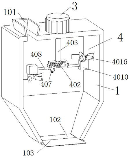 本产品为一种水磨石生产用原料混合装置,涉及水磨石生产技术领域:包括料筒,所述料筒内设置有搅拌机构且搅拌机构与料筒顶部的驱动电机相连接,所述搅拌机构的主传动轴通过锥形齿轮组连接着与其垂直的副传动轴,所述副传动轴两端通过锥形齿轮组活动连接有搅拌叶片;本实用新型具有如下有益效果:本实用新型结构简单、使用方便,通过驱动电机与锥形齿轮的配合带动搅拌叶片在竖直平面搅动的同时还能够水平转动,使得原料混合更均匀,且不同于传统单一方向旋转的搅拌方式,能够有效避免原料受离心力作用产生层析现象。