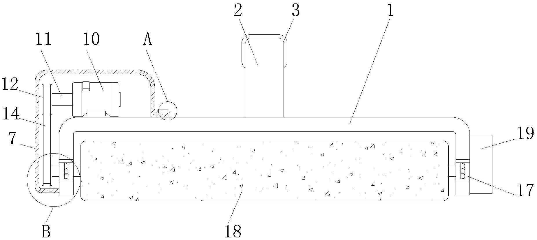 本实用新型涉及铝模复合门窗技术领域,且公开了一种铝木复合门窗生产用清洁装置,包括外壳,所述外壳的顶部固定连接有把手,所述把手的外壁固定连接有防滑套,所述防滑套的外壁开设有防滑槽,所述把手的外壁固定连接有固定环,所述固定环的外壁活动连接有挂绳,所述外壳的顶部固定连接有电机,所述电机的输出端通过联轴器固定连接有转轴。该铝木复合门窗生产用清洁装置,达到了清洁高效的目的,解决了一般的铝木复合门窗生产用清洁装置清洁效率不高的问题,使得人们在使用该铝木复合门窗生产用清洁装置进行铝模复合门窗进行清洁时不会因为清洗过后的脏水不会因为干燥之后灰尘依然附着在门窗的表面,省去了大量的再清洁时间。