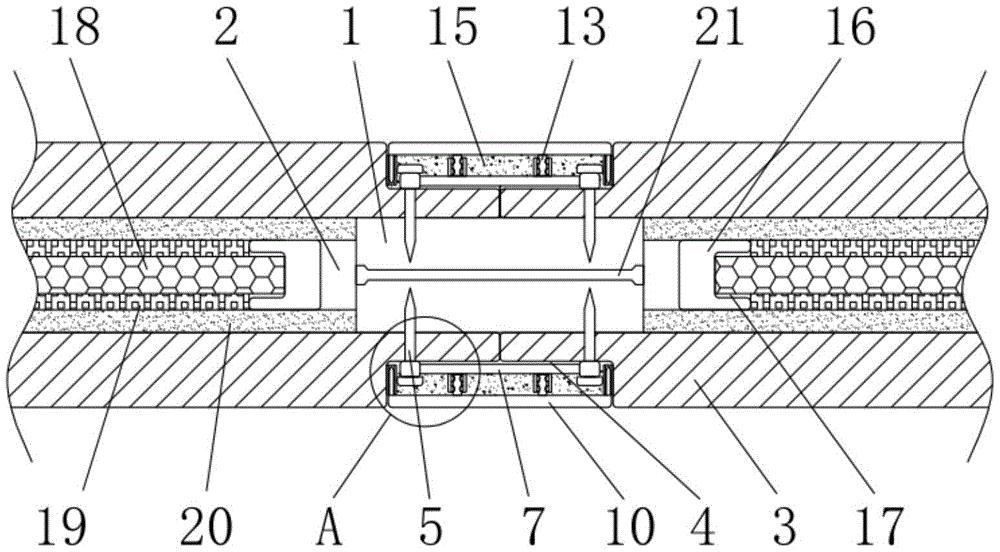 本实用新型公开了一种便于安装的拼接式墙体板材,包括支杆和板材,所述支杆的前后两侧均固定装配有底板,所述支杆的上下两端均与两个板材的内侧紧密贴合,两个同侧所述板材的内侧端均开设有凹槽,所述凹槽的内壁垂直插接有铆钉,且铆接的内侧端贯穿板材插接于支杆的外侧,所述铆钉的外壁均套接有圆环,两个同侧所述圆环之间固定装配有连接杆。通过支杆和底板的配合,通过凹槽和砂浆层的配合,通过圆环和连接杆的配合,圆环和连接杆将用于固定板材的铆钉连接在一起,加强两个板材在拼接时的整体性能,在加强两块板材拼接固定效果的同时挡板使拼接处表面更加的平整,方便对板材的表面加以装饰。