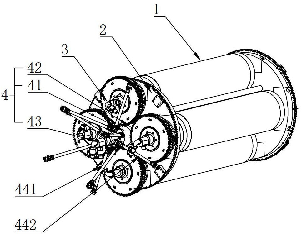 本实用新型公开了一种四辊水路压纹机,包括旋转法兰和四个压纹辊,四个所述压纹辊的端部可旋转的安装在旋转法兰上,所述旋转法兰圆心的位置上设有水路分配器,所述水路分配器包括进水接头、阀体和阀盖以及若干根分配管道,若干根所述分配管道分别与水管接头一一对应连接,所述阀体呈中空圆柱状,所述进水接头设置在阀体的端部上,若干根分配管道设置在阀体侧面上,所述阀盖固定安装在旋转法兰的端面上,所述阀体背向进水接头的一端固定安装在阀盖的端面上,并与阀盖的端面相互密封。本实用新型的四辊水路压纹机,通过水路分配器的设置,便可有效的实现水路分配的效果。