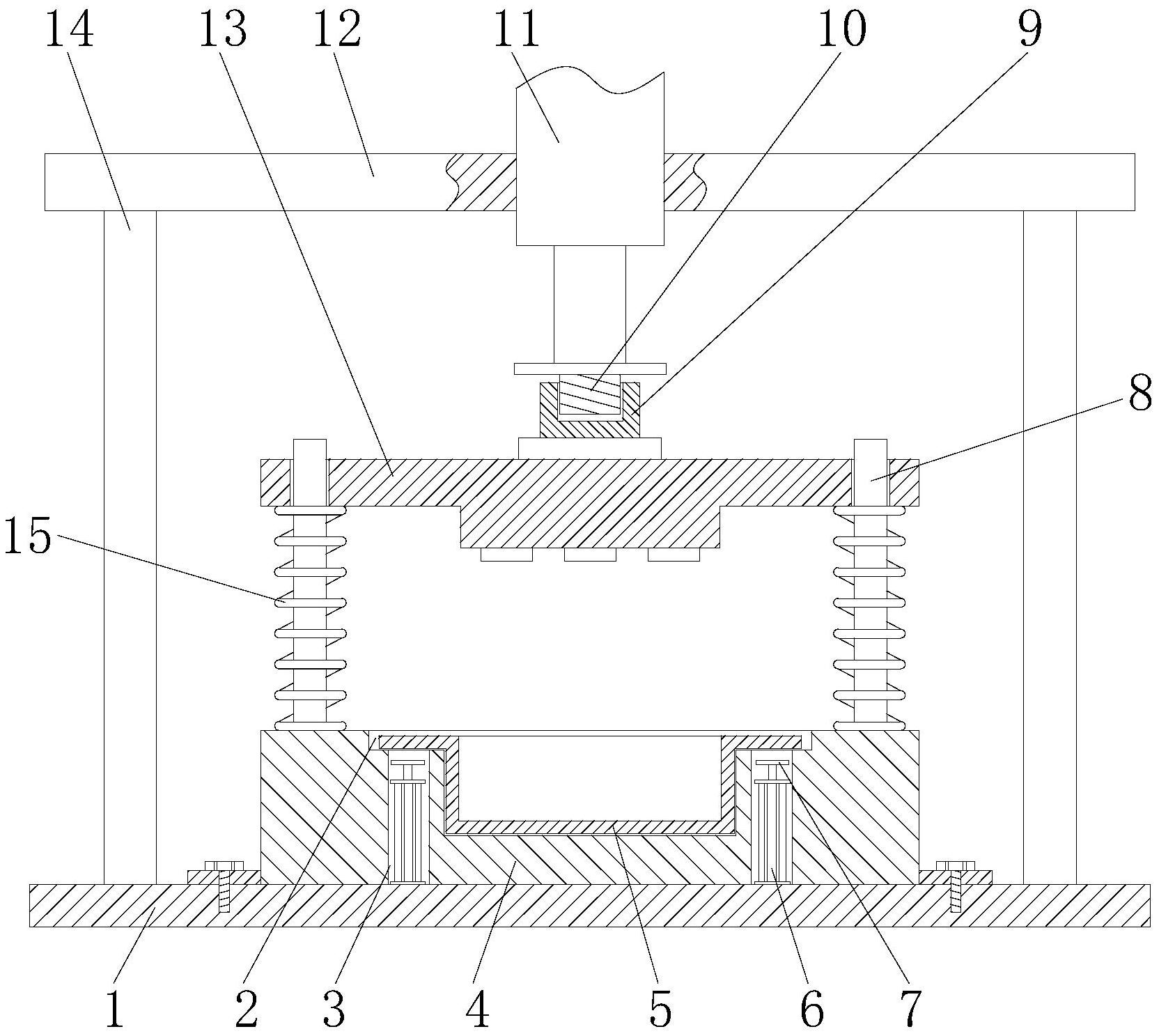 本实用新型公开了一种便于上模的不锈钢模具设备,包括底板,所述底板顶部的中心处固定连接有下模具,所述下模具顶部的中心处开设有放置槽,所述下模具的顶部且位于放置槽内腔两侧的中心处均贯穿开设有通孔,所述底板的顶部且位于通孔的内腔固定连接有气缸,所述气缸的顶部固定连接有顶出板。本实用新型通过放置槽、通孔、下模具、模框、气缸、顶出板、限位柱、螺纹筒、螺纹柱、液压升降柱、上模具、缓冲弹簧、磁铁和铁块的配合使用,具备方便上模的优点,解决了现有的模具通常为固定结构,在添加模料的过程中会受到模具周围各部件的影响而导致不方便加料,同时,成型后的产品不方便取出,从而降低了产品的加工效率的问题。