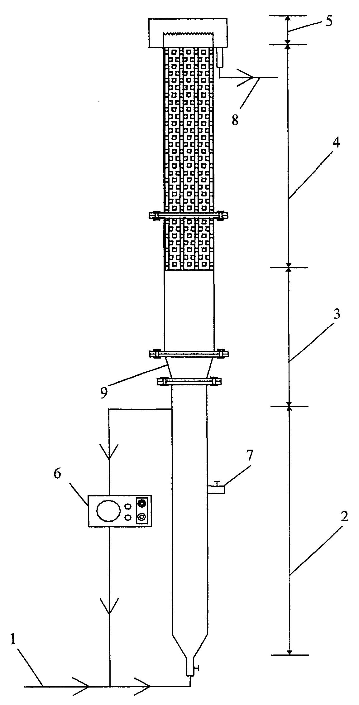 一种升流式复合厌氧水解酸化处理装置及其方法,属于污水处理技术领域,解决了现有工艺水解酸化效率低、易堵塞、构造复杂的问题。其装置底部设有进水管(1),顶部设有集水装置(5),集水装置(5)连接出水管(8),特征在于还包括:自下至上依次为悬浮污泥区(2)、泥水分离区(3)、生物膜强化区(4);悬浮污泥区(2)设有循环泵(6),循环泵(6)分别与悬浮污泥区(2)和进水管(1)连接,形成一个循环回路;悬浮污泥区(2)设有排泥口(7),泥水分离区(3)与悬浮污泥区(2)通过变径接头(9)连接,生物膜强化区(4)填充生物载体。本发明装置及方法简单,水解酸化效率高,可用于生活污水及可生化性较好的工业污水的处理。