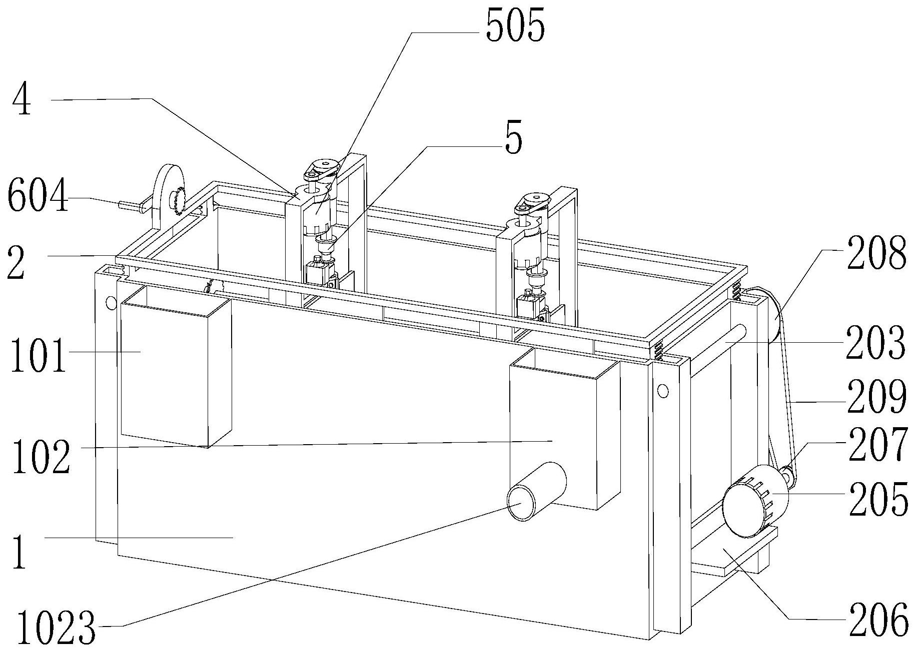 本发明涉及废水处理技术领域,公开了一种电絮凝装置及其处理工艺,包括固定架组件,设置在电解槽内侧,用于固定电解电极,可搅拌电极组件,用于电解生成絮凝所需的阳离子和阴离子及防止离子在电极附近富集;电流换向组件;本发明通过设置固定架组件和可搅拌电极组件,具体的,通过将电极板固定于固定轴外壁,且固定轴的两端采用卡接的方式分别安装在用于支撑的支撑套和卡头之间,然后第二电机通过带传动驱动转轴带动卡头转动,进而带动电极板转动,同时利用电刷与导电环接触对电极板供电,电极在电解的同时进行搅拌,减少阳离子在电极附近富集,防止生成氢氧化物附着电极照成电极钝化,且防止局部污垢脱落照成局部电流增强而过度溶蚀损坏极板。