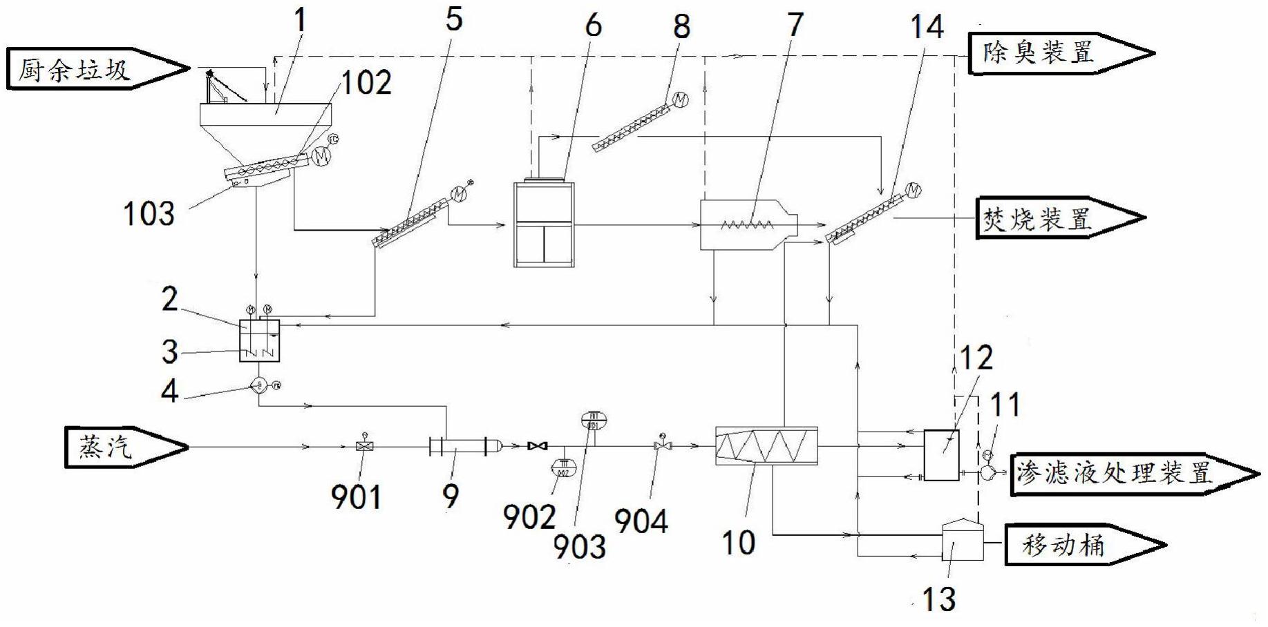 一种餐厨垃圾预处理装置,属于固废处理技术领域。采用两级固液分离加油水分离为核心工艺,智能加热器的智能加热器进料口与沥水输送泵管路连接,管路上设置物料电动调节阀、流量传感器、温度传感器;智能加热器蒸汽进口前端管路设置蒸汽进口电动调节阀;智能加热器出口与三相离心机管路连接,管路上设置物料电动调节阀;接收料仓底部连接仓底螺旋及多孔筛板,仓底螺旋为倾斜无轴螺旋,多孔筛板下为集水槽,经多孔筛板沥出的水分进入螺旋底部集水槽,通过管道连接至沥水池。本实用新型对餐厨垃圾中油分提取,有效降低餐厨垃圾沥水处理负担,通过挤压方法大大降低了餐厨垃圾固渣含水量,为后续资源化处理提供了有效的保障。
