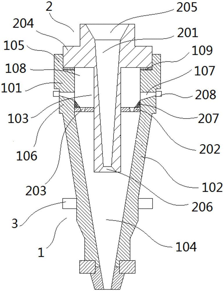 本实用新型涉及一种旋流管,公开了一种淀粉洗涤旋流管,其包括旋流管本体,旋流管本体包括圆筒管段以及锥形管段,圆筒管段的内腔形成圆孔状流道,锥形管段内设有自上而下直径逐渐减小的锥形流道;锥形管段的外侧壁上固定有一能够与锥形管段分离的定位环,定位环包括一端相互铰接的两个半圆环,两个半圆环的另一端形成相互插接。本实用新型通过对旋流管的设计,使得定位环与旋流管分离设计,有效避免对旋流管内壁产生影响,有效提高产品生产质量。
