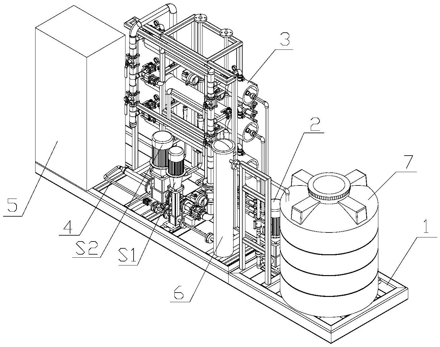 本实用新型公开一种用于卷式膜元件性能筛选的装置,包括机架,所述机架上设置有原水泵、多个膜元件以及连通所述原水泵和多个膜元件的管路,所述管路包括进水管路、进膜主管路、进膜支管路、浓水出水支管路、浓水出水主管路和废水管路,所述进水管路、进膜主管路、进膜支管路、浓水出水支管路、浓水出水主管路和废水管路中分别设置一个或多个用于切断或流通的阀门件,通过这些阀门的切换实现多个卷式膜元件运行方式的改变,可减少小试过程中频繁更改管道的工作量,也可避免不同项目需要制作多套小试装置的局面,从而降低小试投入,加速小试进程。