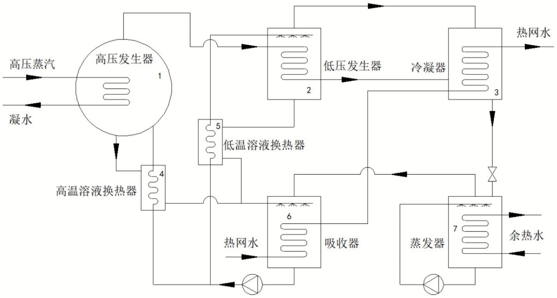 本实用新型涉及余热利用技术领域,尤其是涉及一种高压蒸汽驱动的复合式热泵,包括高压发生器、低压发生器、冷凝器、高温溶液换热器、低温溶液换热器、吸收器、蒸发器和蒸汽引射器,其中高压发生器、低压发生器、冷凝器、高温溶液换热器、低温溶液换热器、吸收器、蒸发器构成经典的双效第一类吸收式热泵,所述蒸汽引射器设在所述高压发生器与所述低压发生器之间,高压蒸汽管道和所述高压发生器与所述蒸汽引射器的引射入口相通,所述蒸汽引射器的出口与所述低压发生器相通。本实用新型通过将两种设备结合,各自发挥自己的优势,实现了更高的效率,也避开了双效热泵出水温度低、单效热泵效率低、引射式热泵变工况能力差的情况。