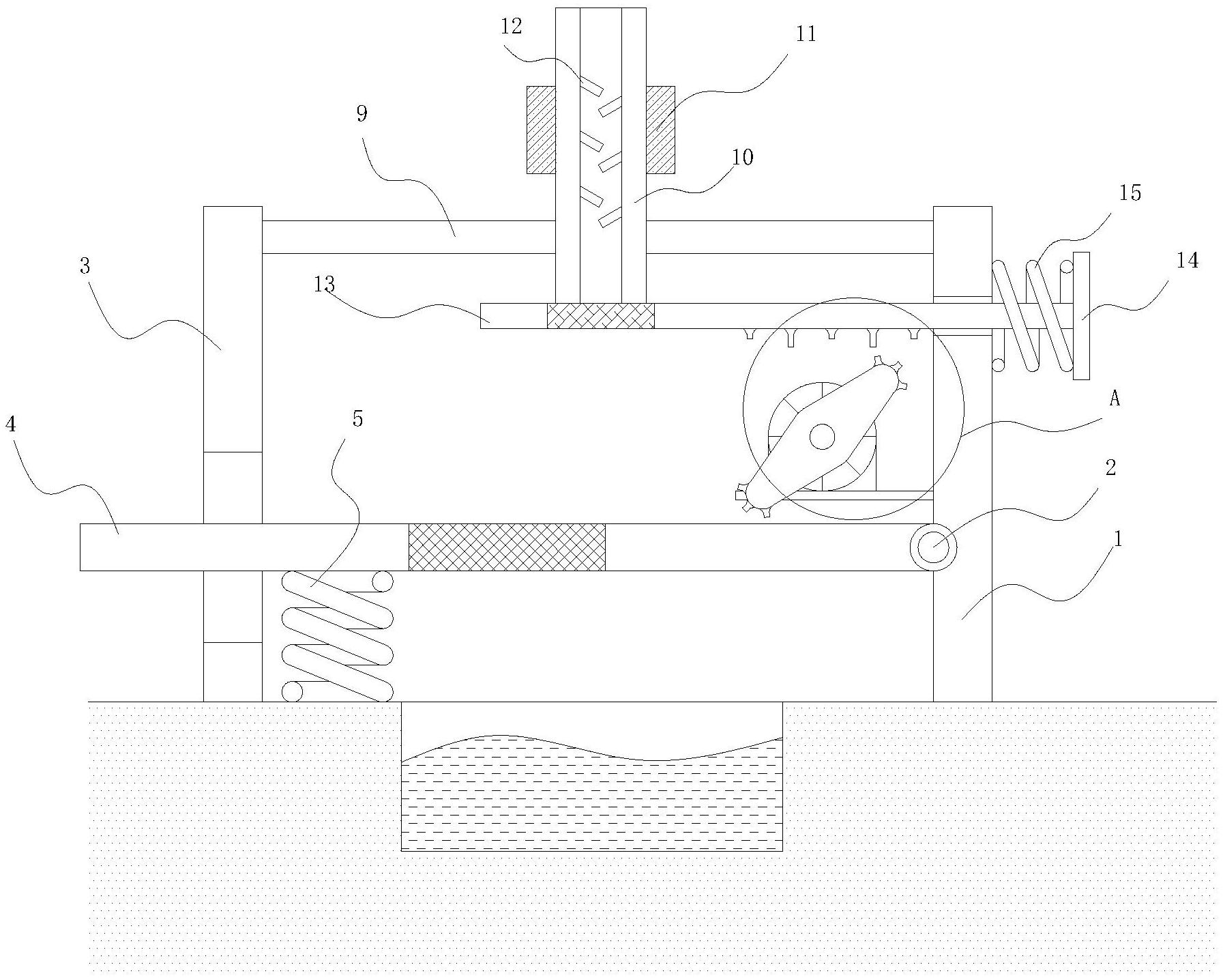 本实用新型涉及污水处理技术领域,公开了一种屠宰场用污水处理设备,包括第一支撑杆,第一支撑杆的底部与地面固定连接,第一支撑杆的左侧与固定板的右侧固定连接,第一支撑杆的顶部与电机的底部固定连接,电机的前端输出轴与转板的中心孔固定连接,转板的形状为菱形且两个较长边上安装有齿牙,转板通过齿牙与活动板底部安装的齿牙啮合,活动板底部安装有较长和较短的两类齿牙且两类齿牙均与转板上安装的齿牙啮合。本实用新型起到了能够定量对污水内的血块进行倾倒的同时防止排水管继续排水,导致水通过过滤板倾斜向左侧流动,防止水源浪费的效果。