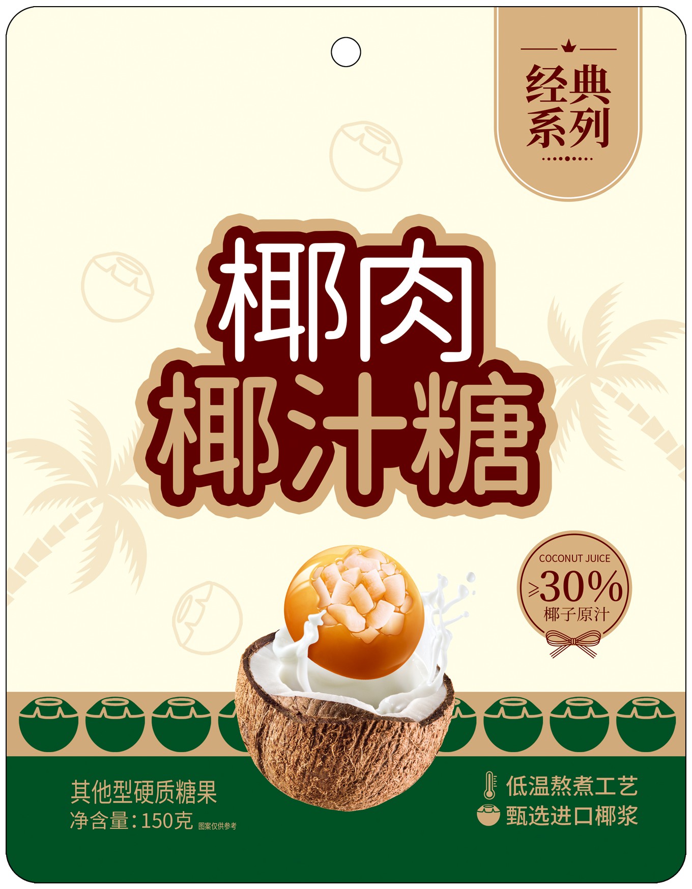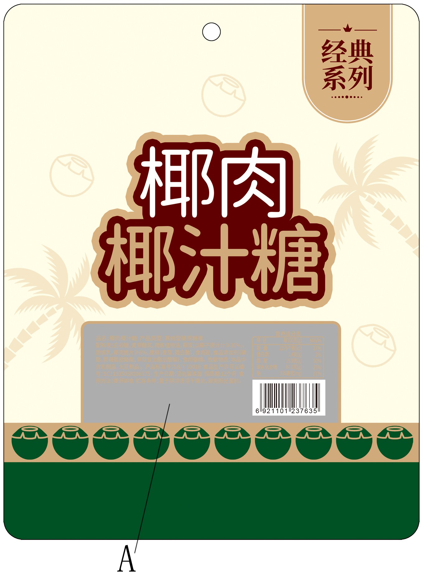 1.本外观设计产品的名称:包装袋(椰肉椰汁糖大)。2.本外观设计产品的用途:用于包装糖果。3.本外观设计产品的设计要点:在于图案。4.最能表明设计要点的图片或照片:主视图。5.本外观设计产品为薄型产品,省略其他视图。6.其他需要说明的情形其他说明:标记A区域表示为透明。