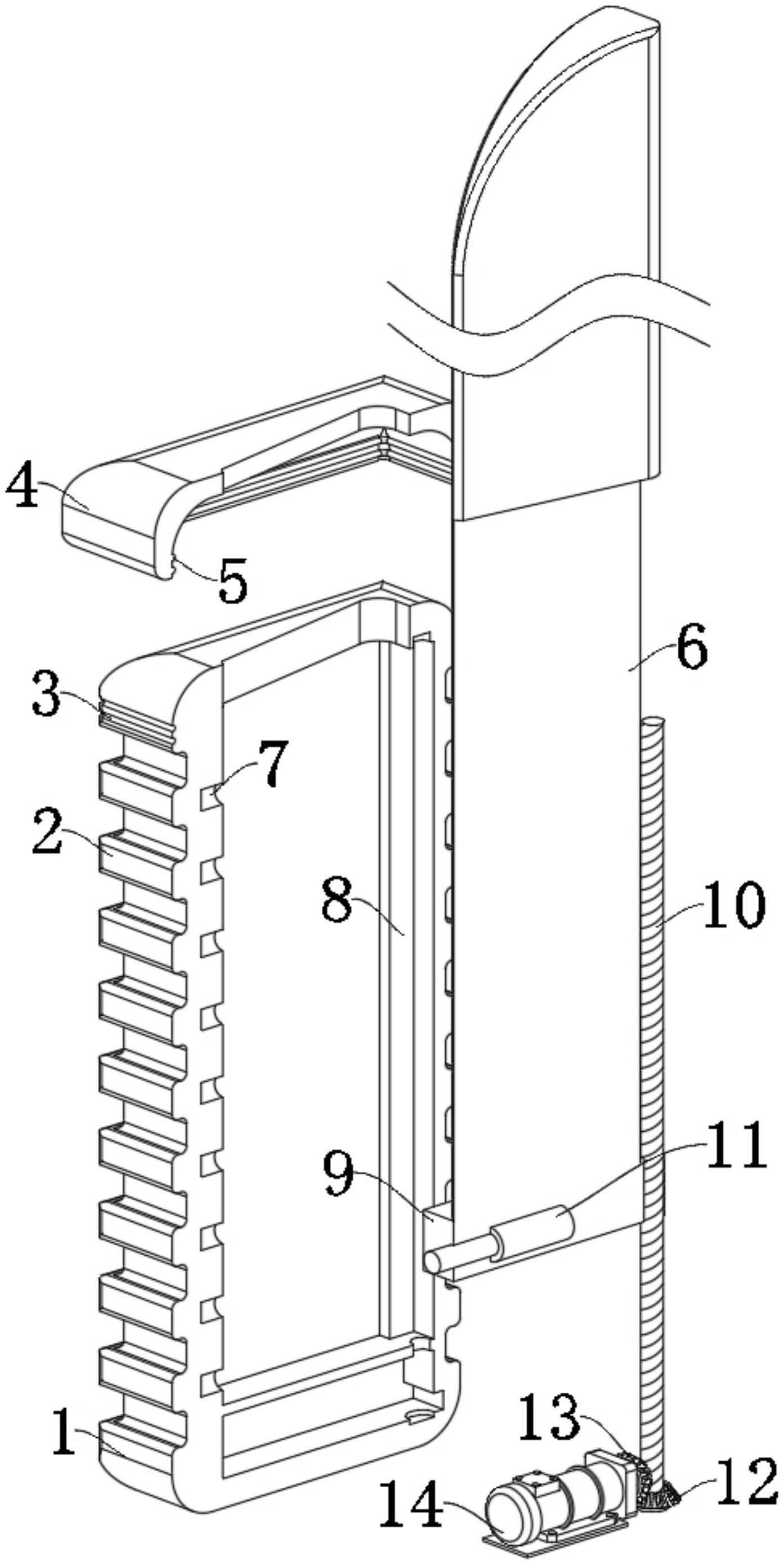 本实用新型公开了一种肉鸭屠宰用手持自动砍壳设备,涉及家禽屠宰分割技术领域,包括:刀柄,调长机构,设于刀柄内,用以装置的整体长度调整,其中:调长机构包括驱动部件、限位部件、丝杆和安装块,安装块滑动连接于刀柄内,限位部件设于刀柄内,且限位部件连接于安装块。该肉鸭屠宰用手持自动砍壳设备,通过调长机构的使用,可以使装置的整体长度进行调整,满足不同长度的鸭脖处理,提高砍壳鸭脖带关节合格率,提高产品出成,并且,增加使用时的安全性,该肉鸭屠宰用手持自动砍壳设备,通过清理机构的使用,可以将使用后的装置表面黏着物快速进行清理,避免人工清理受伤,提高员工效率以及安全性,降低劳动强度。